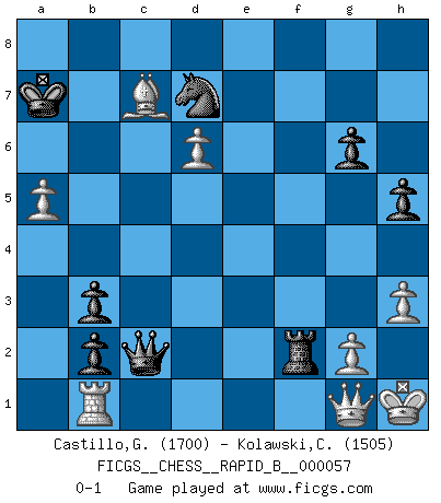 Last move : 0-1 2007 October 15 6:42:0 [Event "FICGS__CHESS__RAPID_B__000057"] [Site "FICGS"] [Date "2007.06.26"] [Round "1"] [White "Castillo,German"] [Black "Kolawski,Christof"] [Result "0-1"] [WhiteElo "1700"] [BlackElo "1505"] 1.d4 d5 2.e4 c6 3.Nc3 dxe4 4.f3 exf3 5.Nxf3 Nf6 6.Bc4 Bf5 7.O-O e6 8.Ne5 Bxc2 9.Nxf7 Kxf7 10.Bxe6+ Kxe6 11.Qxc2 Kd7 12.Bg5 Kc8 13.d5 Nbd7 14.Kh1 Qc7 15.Rac1 c5 16.Bf4 Qa5 17.Rce1 b5 18.a4 b4 19.Nb5 a6 20.Nc7 Ra7 21.Ne8 Qd8 22.Nxf6 Nxf6 23.Qf5+ Kb7 24.d6 Qc8 25.Re6 Nd7 26.Rfe1 Qc6 27.Re8 a5 28.b3 g6 29.Qf7 Kb6 30.Bg5 Bg7 31.Bd8+ Ka6 32.Qxg7 Rxe8 33.Rxe8 c4 34.Re1 cxb3 35.Qd4 Qc3 36.Qe4 Rb7 37.Qe2+ Ka7 38.Bxa5 Qc2 39.Qf1 b2 40.Bc7 b3 41.a5 h5 42.Qg1+ Ka6 43.Qf1+ Rb5 44.Rb1 Ka7 45.h3 Rf5 46.Qg1+ Rf2 0-1 This chess game has been lost on time (started : 2007.06.26 21:52:44) Blackmar gambit Kingside Castling by player White (move 7) Player Black won this chess game. Follow this game move after move (download)Chess makes man wiser and clear-sighted. (Vladimir Putin) Rauchen ist dem Schachspieler bei seiner Arbeit, also im Wettkampf, untersagt. (Viktor Kortschnoi) El Ajedrez lo es todo: arte, ciencia y deporte. (Anatoly Karpov) Un millionnaire : 'Monsieur Steinitz ! Vous ne participez aux tournois que pour l'argent, alors que moi je n'y viens que pour l'honneur.' Steinitz : 'Chacun joue pour ce qu'il n'a pas'... I've never seen so many men wasted so badly. (Blondie in The Good, The Bad and The Ugly)