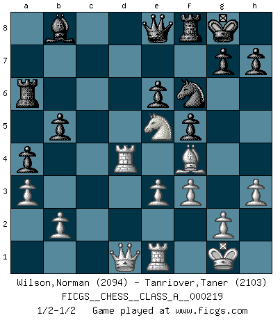 Last move : 1/2-1/2 2020 January 22 19:18:57 [Event "FICGS__CHESS__CLASS_A__000219"] [Site "FICGS"] [Date "2019.10.13"] [Round "1"] [White "Wilson,Norman"] [Black "Tanriover,Taner"] [Result "1/2-1/2"] [WhiteElo "2094"] [BlackElo "2103"] 1.d4 f5 2.Nf3 Nf6 3.Bg5 e6 4.Nbd2 Be7 5.e3 O-O 6.Bd3 b6 7.O-O Bb7 8.c3 d5 9.Ne5 Nbd7 10.Nxd7 Qxd7 11.Nf3 a5 12.Ne5 Qe8 13.Be2 a4 14.Rc1 c5 15.Re1 Bd6 16.Bf4 Ne4 17.f3 Nf6 18.a3 Bb8 19.Bd3 Ba6 20.Bxa6 Rxa6 21.c4 dxc4 22.Rxc4 cxd4 23.Rxd4 b5 24.h3 1/2-1/2 Dutch Kingside Castling by player Black (move 5) Kingside Castling by player White (move 7) This chess game ended in a draw. Follow this game move after move (download)I don't believe in psychology. I believe in good moves. (Bobby Fischer) Glücklicherweise sind Großmeister Ruben Fines reine Schachbücher weniger phallozentrisch [als seine Schachpsychologie] und deswegen auch weniger lächerlich. (Nigel Short) ¿Que sería del Ajedrez sin errores graciosos?. (Kurt Richter) Donnez-moi un Cavalier en 6e et je gagnerais toutes mes parties. (Steinitz) Big Chess is a place for big hallucinations. (Thibault de Vassal)