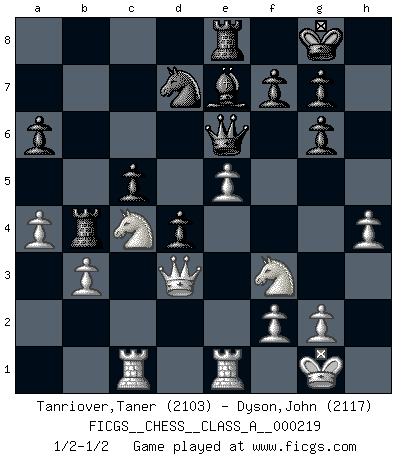 Last move : 1/2-1/2 2020 April 11 22:19:37 [Event "FICGS__CHESS__CLASS_A__000219"] [Site "FICGS"] [Date "2019.10.13"] [Round "1"] [White "Tanriover,Taner"] [Black "Dyson,John"] [Result "1/2-1/2"] [WhiteElo "2103"] [BlackElo "2117"] 1.Nf3 d5 2.d4 Nf6 3.c4 c6 4.e3 Bg4 5.h3 Bh5 6.Bd3 e6 7.O-O Nbd7 8.Nbd2 Be7 9.b3 O-O 10.Bb2 a6 11.Qc2 Rc8 12.Rac1 Bg6 13.Bxg6 hxg6 14.a3 Re8 15.Rfd1 Qc7 16.a4 b6 17.Bc3 c5 18.dxc5 bxc5 19.Qb2 Ne4 20.cxd5 Nxc3 21.Qxc3 exd5 22.Qd3 Qb7 23.e4 d4 24.e5 Qb6 25.Nc4 Qe6 26.h4 Rb8 27.Re1 Rb4 1/2-1/2 Reti Opening Kingside Castling by player White (move 7) Kingside Castling by player Black (move 9) This chess game ended in a draw. Follow this game move after move (download)It began to feel as though you were playing against Chess itself. - On playing against Robert Fischer. (Walter Shipman) Capablanka war das größte Genie der Schachgeschichte! Aber denken sie nicht er habe nichts vom Schach verstanden. Er wusste nur soviel wie er wissen musste um seine Ziele zu erreichen. (Mikhail Moiseyevich Botvinik) Del Ajedrez se ha dicho que la vida no es lo suficientemente larga para él, pero eso es culpa de la vida, no del Ajedrez. (William Ewart Napier) Un footballeur joue avec ses pieds, parfois avec sa tête. Un joueur d'échecs ne joue qu'avec sa tête. Et quand il ne joue plus, il meurt. (Jacob Murray) Over-the-board chess is the favorite of mortals, correspondence chess is the favorite of the gods. (Eduard Dyckhoff)
