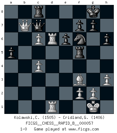 Last move : 1-0 2007 September 25 15:55:8 [Event "FICGS__CHESS__RAPID_B__000057"] [Site "FICGS"] [Date "2007.06.26"] [Round "1"] [White "Kolawski,Christof"] [Black "Cridland,Graham"] [Result "1-0"] [WhiteElo "1505"] [BlackElo "1406"] 1.e4 c5 2.Nf3 e6 3.d4 cxd4 4.Nxd4 Nc6 5.Nc3 Qc7 6.Be2 a6 7.O-O Nf6 8.Be3 Bb4 9.Na4 Be7 10.Nxc6 bxc6 11.Nb6 Rb8 12.Nxc8 Qxc8 13.Bd4 c5 14.Be5 Rb6 15.Qd3 Qc6 16.Bf3 c4 17.Qe3 O-O 18.Bc3 Ne8 19.e5 d5 20.exd6 Qxd6 21.b3 Bf6 22.Rad1 Qb8 23.bxc4 Bxc3 24.Qxc3 Qc7 25.c5 Rb5 26.c6 Nf6 27.h3 Rc8 28.Be2 Nd5 29.Qe1 Ra5 30.c4 Nf6 31.Bf3 h6 32.Qe3 Rxa2 33.Qb3 Ra5 34.Qb7 Rf5 35.Rd6 a5 36.Rfd1 1-0 This chess game has been lost on time (started : 2007.06.26 21:52:44) Sicilian : Taimanov (Bastrikov) variation Kingside Castling by player White (move 7) Kingside Castling by player Black (move 17) Player White won this chess game. Follow this game move after move (download)My opponents make good moves too. Sometimes I don't take these things into consideration. (Bobby Fischer) Gewöhnliche Menschen denken nur daran, wie sie ihre Zeit verbringen. Ein intelligenter Mensch versucht, sie auszunutzen. (Arthur Schopenhauer) Siempre es mejor sacrificar los hombres de tu oponente. (Savielly Tartakower) Je menace de comprendre la position. (Anonyme) If everyone is thinking alike, then somebody isn't thinking. (US General George S. Patton)