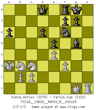 Last move : 1/2-1/2 2019 November 30 4:59:32 [Event "FICGS__CHESS__RAPID_M__000109"] [Site "FICGS"] [Date "2019.10.15"] [Round "1"] [White "Kuhne,Detlev"] [Black "Farnik,Kym"] [Result "1/2-1/2"] [WhiteElo "2275"] [BlackElo "2123"] 1.e4 c5 2.Nf3 d6 3.d4 cxd4 4.Nxd4 Nf6 5.Nc3 a6 6.h3 e5 7.Nb3 Be7 8.g4 h6 9.Be3 Nbd7 10.f3 b5 11.a4 bxa4 12.Rxa4 Nb6 13.Bb5+ Nfd7 14.Bxb6 Qxb6 15.Nd5 Bh4+ 16.Kd2 Bg5+ 17.Kc3 Qd8 18.Bc6 Rb8 19.Qg1 Bb7 20.Bxb7 Rxb7 21.Rb4 Rxb4 22.Kxb4 Nf6 23.Nc3 O-O 24.h4 Bf4 25.g5 hxg5 26.hxg5 Bxg5 27.Ka3 1/2-1/2 Sicilian : Najdorf, Adams attack Kingside Castling by player Black (move 23) This chess game ended in a draw. Follow this game move after move (download)Chess is war over the board. The object is to crush the opponents mind. (Bobby Fischer) Stelle das Brett so, daß die Sonne in die Augen deines Gegners scheint. (Ruy López) El Ajedrez hace al hombre ser mas sabio y ver mas claro. (Vladimir Putin) On a dit que l'homme se distingue de l'animal par le fait qu'il achète plus de livres qu'il ne peut en lire. Je voudrais suggérer qu'inclure à la liste des livres quelques livres d'échecs rendrait la distinction manifeste. (Edward Lasker) Begin at the beginning and go on till you come to the end; then stop. (Lewis Carrol, Alice in Wonderland)