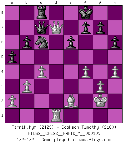 Last move : 1/2-1/2 2019 November 18 22:44:7 [Event "FICGS__CHESS__RAPID_M__000109"] [Site "FICGS"] [Date "2019.10.15"] [Round "1"] [White "Farnik,Kym"] [Black "Cookson,Timothy"] [Result "1/2-1/2"] [WhiteElo "2123"] [BlackElo "2160"] 1.d4 d5 2.c4 c6 3.Nf3 Nf6 4.e3 e6 5.Bd3 Nbd7 6.b3 Bd6 7.Bb2 O-O 8.Nbd2 b6 9.O-O Bb7 10.Re1 c5 11.e4 dxe4 12.Nxe4 Be7 13.Qe2 cxd4 14.Nxd4 Qc8 15.Rad1 a6 16.Nf3 h6 17.Ne5 Nxe5 18.Bxe5 Bxe4 19.Bxe4 Ra7 20.Bf3 Rd7 21.Rxd7 Nxd7 22.Bd4 a5 23.Rd1 Rd8 24.Qb2 Bf6 25.g3 Qc7 26.Kg2 Rc8 27.h4 Bxd4 28.Qxd4 Ne5 29.Be2 Kf8 30.f4 Nc6 31.Qd7 1/2-1/2 QGD Slav : 4.e3 Kingside Castling by player Black (move 7) Kingside Castling by player White (move 9) This chess game ended in a draw. Follow this game move after move (download)Look at Garry Kasparov. After he loses, invariably he wins the next game. He just kills the next guy. That's something that we have to learn to be able to do. (Maurice Ashley) Ich könnte leicht behaupten: Ja,ja, Leonid Breschnew wollte nicht, daß ich Weltmeister werde. In der Tat war die Sache komplizierter. (Viktor Kortschnoi) ¿Porque tengo que perder ante este idiota?. (Aron Nimzovich) Horreur, mais aussi harmonie suprême : qu'y avait-il en effet au monde en dehors des échecs ? Le brouillard, l'inconnu, le non-être... (Vladimir Nabokov) They say poker is a zero-sum game. It must be, because every time I play my sum ends up zero. (Max Shapiro)
