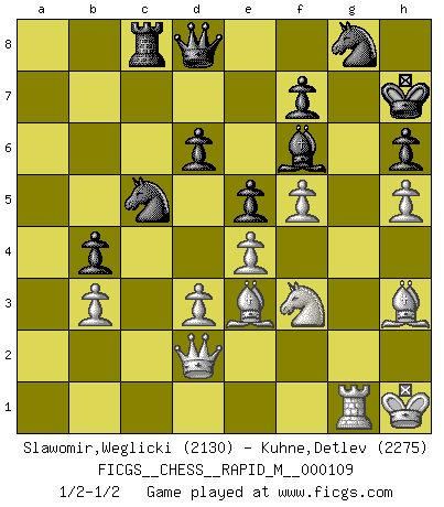Last move : 1/2-1/2 2019 November 30 9:4:32 [Event "FICGS__CHESS__RAPID_M__000109"] [Site "FICGS"] [Date "2019.10.15"] [Round "1"] [White "Slawomir,Weglicki"] [Black "Kuhne,Detlev"] [Result "1/2-1/2"] [WhiteElo "2130"] [BlackElo "2275"] 1.e4 c5 2.Nf3 d6 3.d3 Nc6 4.g3 g6 5.Bg2 Bg7 6.O-O Nf6 7.Re1 O-O 8.c3 Bg4 9.h3 Bxf3 10.Bxf3 Nd7 11.Be3 b5 12.a3 Rb8 13.Bg2 Qc7 14.f4 e6 15.Nd2 a5 16.Rc1 Nb6 17.h4 Qd7 18.Nf3 Ne7 19.Rc2 b4 20.cxb4 axb4 21.axb4 cxb4 22.b3 Rfc8 23.h5 Rxc2 24.Qxc2 Qd8 25.g4 gxh5 26.gxh5 Nd7 27.Qf2 h6 28.f5 e5 29.Kh1 Kh7 30.Bh3 Bf6 31.Rg1 Nc5 32.Qc2 Rc8 33.Qd2 Ng8 1/2-1/2 Sicilian Kingside Castling by player White (move 6) Kingside Castling by player Black (move 7) This chess game ended in a draw. Follow this game move after move (download)No price is too great for the scalp of the enemy King. (Koblentz) Unter Putin wird alles Geld aus Russland wie von einem Staubsauger nach Moskau umgeleitet, das ist wie ein schwarzes Loch. (Garry Kasparov) Si un gobernante no entiende al Ajedrez, ¿como puede governar él un reinado?. (El Rey Khusros II) Tous ces prétendus hommes politiques sont les pions, les Cavaliers, les Tours ou les Fous d'une partie d'échecs qui se jouera tant qu'un hasard ne renversera pas l'échiquier. (Honoré de Balzac) He who defends everything defends nothing. (Frederick the Great)