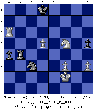 Last move : 1/2-1/2 2020 January 24 17:17:35 [Event "FICGS__CHESS__RAPID_M__000109"] [Site "FICGS"] [Date "2019.10.15"] [Round "1"] [White "Slawomir,Weglicki"] [Black "Yarkov,Evgeny"] [Result "1/2-1/2"] [WhiteElo "2130"] [BlackElo "2155"] 1.d4 d5 2.c4 Nf6 3.Nc3 e6 4.cxd5 exd5 5.Bg5 Be7 6.e3 h6 7.Bh4 c6 8.Bd3 O-O 9.Qc2 Re8 10.Nge2 Nbd7 11.O-O Nh5 12.Bxe7 Qxe7 13.Rab1 Nb6 14.b3 Bd7 15.Rfe1 Rad8 16.a4 a6 17.Ra1 a5 18.Qb2 Qb4 19.Qa3 Qxa3 20.Rxa3 Nc8 21.Rb1 Nd6 22.b4 axb4 23.Rxb4 Ra8 24.Ra1 Re7 25.h3 g5 26.Nc1 f5 27.Rb6 Be6 28.a5 Nc8 29.Rb2 Nf6 30.Nb3 Nd6 31.a6 bxa6 32.Na5 Rc7 33.Na4 f4 34.Nc5 Bf5 35.exf4 gxf4 36.Rb6 Bxd3 37.Nxd3 Nc4 38.Rxc6 Rxc6 39.Nxc6 f3 40.gxf3 a5 41.Ra4 Kf8 42.Nf4 Ra6 43.Ne5 Nb6 44.Ra1 Nc4 45.Ng4 a4 46.Nxf6 Rxf6 47.Nxd5 Ra6 48.Nb4 Ra8 49.Nc2 Nd6 50.Na3 Rb8 51.Rc1 Rb3 52.Rc6 Ke7 53.Nc2 Rxf3 54.Kg2 Rf5 55.Ra6 Ne4 56.f3 Nc3 57.Kf2 Rb5 58.Ne3 Rb4 59.d5 Kd7 60.Nf5 h5 61.Ra7+ Kd8 62.Ra6 1/2-1/2 QGD : Marshall defense Kingside Castling by player Black (move 8) Kingside Castling by player White (move 11) This chess game ended in a draw. Follow this game move after move (download)Human affairs are like a Chess game: only those who do not take it seriously can be called good players. (Hung Tzu Ch'eng) Intelligenz läßt sich nicht am Weg, sondern nur am Ergebnis feststellen. (Garry Kasparov) Cada Peón es potencialmente una Reina. (James Mason) Tout change constamment, y compris dans le monde des Echecs. (Botvinnik) The ultimate in disposing one's troops is to be without ascertainable shape. Then the most penetrating spies cannot pry in nor can the wise lay plans against you. (Sun Tzu)