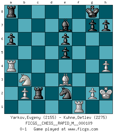 Last move : 0-1 2020 January 22 7:15:23 [Event "FICGS__CHESS__RAPID_M__000109"] [Site "FICGS"] [Date "2019.10.15"] [Round "1"] [White "Yarkov,Evgeny"] [Black "Kuhne,Detlev"] [Result "0-1"] [WhiteElo "2155"] [BlackElo "2275"] 1.e4 c5 2.Nf3 d6 3.d4 cxd4 4.Nxd4 Nf6 5.Nc3 a6 6.Nb3 e5 7.Bg5 Nbd7 8.f3 Be7 9.h4 b5 10.a4 bxa4 11.Nxa4 Nb6 12.Nxb6 Qxb6 13.Qd2 O-O 14.Bc4 Be6 15.Be3 Qc7 16.Bxe6 fxe6 17.O-O d5 18.Qa5 Rfc8 19.Qxc7 Rxc7 20.Rfc1 dxe4 21.fxe4 Nxe4 22.Ra4 Ng3 23.Kh2 Ne2 24.Rf1 Rxc2 0-1 Sicilian : Najdorf Kingside Castling by player Black (move 13) Kingside Castling by player White (move 17) Player Black won this chess game. Follow this game move after move (download)A bad plan is better than none at all. (Frank Marshall) Du musst nicht gut spielen, es reicht, wenn du besser spielst als dein Gegner. (Anonymous) El Ajedrez por encima de todo... ¡es una pelea!. (Emanuel Lasker) C'est la seule position que je connaisse où les deux camps sont mals. Propos prêtés à V. Anand. . 'gn is not allowed in chess unless n is an integer between 1 and 8 inclusive, where 1 and 8 are to interpreted as the standard numerals standing for integers in the ordered real-closed field R, with the *canonical* ordering. (As opposed to, say, an integer in the domain Z[2+i*sqrt(5)] or an integer in some exotic Grothendieck topos). (Normajean Yates)