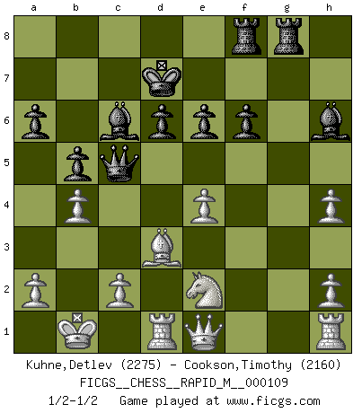 Last move : 1/2-1/2 2019 December 7 4:21:14 [Event "FICGS__CHESS__RAPID_M__000109"] [Site "FICGS"] [Date "2019.10.15"] [Round "1"] [White "Kuhne,Detlev"] [Black "Cookson,Timothy"] [Result "1/2-1/2"] [WhiteElo "2275"] [BlackElo "2160"] 1.e4 c5 2.Nf3 Nc6 3.d4 cxd4 4.Nxd4 Nf6 5.Nc3 d6 6.Bg5 e6 7.Qd2 a6 8.O-O-O Bd7 9.f4 h6 10.Bh4 b5 11.Bxf6 gxf6 12.f5 Qb6 13.Nxc6 Bxc6 14.Kb1 h5 15.fxe6 fxe6 16.Qe1 O-O-O 17.Bd3 Rg8 18.Ne2 Bh6 19.Qc3 Rdf8 20.g3 Qc5 21.Qe1 h4 22.gxh4 Kd7 23.b4 1/2-1/2 Sicilian defense Queenside Castling by player White (move 8) Queenside Castling by player Black (move 16) This chess game ended in a draw. Follow this game move after move (download)Chess is the art of analysis. (Mikhail Botvinnik) Sitze auf Deine Hände. (Siegbert Tarrasch) No hay precio que no valga la pena por la cabellera del Rey enemigo. (Koblentz) La tactique, c'est ce que vous faites quand il y a quelque chose à faire; la stratégie, c'est ce que vous faites quand il n'y a rien à faire. (Savielli Tartacower) At last I discovered the true beauty of chess. So I proposed to her. (Dinesh De Silva)