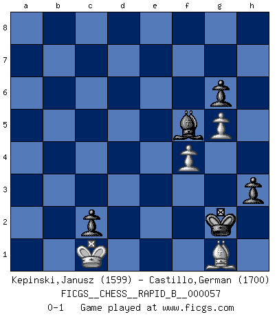 Last move : 0-1 2007 November 12 22:8:44 [Event "FICGS__CHESS__RAPID_B__000057"] [Site "FICGS"] [Date "2007.06.26"] [Round "1"] [White "Kepinski,Janusz"] [Black "Castillo,German"] [Result "0-1"] [WhiteElo "1599"] [BlackElo "1700"] 1.d4 d5 2.c4 dxc4 3.e3 Nf6 4.Bxc4 e6 5.Nf3 c5 6.O-O a6 7.a4 Nc6 8.Qe2 cxd4 9.Rd1 Be7 10.Nxd4 Nxd4 11.Rxd4 Qc7 12.Nc3 O-O 13.Bd3 e5 14.Rc4 Qd6 15.Ne4 Nxe4 16.Bxe4 Be6 17.Rc3 Qb4 18.Bc2 Rad8 19.a5 f5 20.Ra4 Qb5 21.Qxb5 axb5 22.Ra1 b4 23.Rc7 b3 24.Rxe7 bxc2 25.f3 Rd1+ 26.Kf2 Bd7 27.Rxe5 Rc8 28.e4 Rc4 29.exf5 Ra4 30.Rxa4 Bxa4 31.Re1 Kf7 32.h4 Bb3 33.Bg5 h6 34.Bc1 Ba4 35.g4 Bc6 36.f4 h5 37.g5 Bd7 38.b4 Bxf5 39.b5 Rd4 40.Re5 g6 41.Rc5 Ra4 42.Rc7+ Ke6 43.Rxb7 Rxa5 44.Ke2 Ra1 45.Kd2 Rb1 46.b6 Rb3 47.Rb8 Kd5 48.Ra8 Rxb6 49.Ra4 Rb3 50.Ra3 Rb4 51.Kc3 Rc4+ 52.Kb3 Kd4 53.Ra4 Rxa4 54.Kxa4 Ke4 55.Kb3 Kf3 56.Kc3 Kg4 57.Be3 Kxh4 58.Bd2 Kg4 59.Kb2 h4 60.Be3 Kf3 61.Bg1 h3 62.Kc1 Kg2 0-1 Queen's gambit accepted Kingside Castling by player White (move 6) Kingside Castling by player Black (move 12) 10 pieces endgame at move 54 : White KBPPP , Black KBPPP WHITE : King + 1 Bishop 3 Pawns BLACK : King + 1 Bishop 3 Pawns 9 pieces endgame at move 57 : White KBPP , Black KBPPP WHITE : King + 1 Bishop 2 Pawns BLACK : King + 1 Bishop 3 Pawns Player Black won this chess game. Follow this game move after move (download)Of all my Russian books, the defense contains and diffuses the greatest 'warmth' which may seem odd seeing how supremely abstract Chess is supposed to be. (Vladimir Nabokov) Schon mancher Spieler hat aufgegeben, um zu vermeiden, daß er eine Figur verliert. (Savielly Grigorievitsch Tartakower) Todos los jugadores de Ajedrez deberían tener un pasatiempo. (Savielly Tartakower) Les erreurs sont comme les malheurs, elles n'arrivent jamais seules. (Siegbert Tarrasch) All politicians must be presumed guilty until they are proven innocent. (Dinesh De Silva)