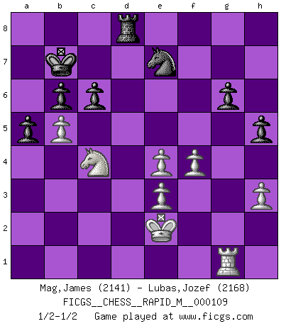 Last move : 1/2-1/2 2019 November 11 20:31:33 [Event "FICGS__CHESS__RAPID_M__000109"] [Site "FICGS"] [Date "2019.10.15"] [Round "1"] [White "Mag,James"] [Black "Lubas,Jozef"] [Result "1/2-1/2"] [WhiteElo "2141"] [BlackElo "2168"] 1.e4 e5 2.Nf3 Nc6 3.Bb5 a6 4.Bxc6 dxc6 5.O-O Bg4 6.h3 h5 7.d3 Qf6 8.Be3 Bxf3 9.Qxf3 Qxf3 10.gxf3 Bd6 11.Nd2 Ne7 12.Nc4 Ng6 13.Rfd1 O-O-O 14.Kf1 Be7 15.c3 c5 16.a3 f5 17.b4 cxb4 18.axb4 Bf6 19.Ke2 Ne7 20.d4 exd4 21.cxd4 Rhe8 22.Rac1 Kb8 23.Rb1 b6 24.b5 a5 25.Rd3 Kb7 26.Rc1 g6 27.Rg1 f4 28.Bxf4 Rxd4 29.Rxd4 Bxd4 30.Be3 Bxe3 31.fxe3 Rd8 32.f4 c6 1/2-1/2 Ruy Lopez : Exchange variation, Alapin gambit Kingside Castling by player White (move 5) Queenside Castling by player Black (move 13) This chess game ended in a draw. Follow this game move after move (download)Pawn endings are to Chess what putting is to golf. (Cecil Purdy) Sicherlich können nur Meister einen Stil haben. Daß ein nicht-Meister auch nur ein einziges Mal in seinem Leben eine Partie folgerecht durchführte, habe ich niemals bemerkt. (Emanuel Lasker) Un entendimiento a fondo de las continuaciones típicas del mate, hace de las combinaciones de sacrificio mas complicadas conducirlas a ellas no solo sin dificultad, sino casi de una manera natural. (Siegbert Tarrasch) Il (Jacob Murray) ne joue pas pour le bon coup, mais pour le meilleur. (Eloi Relange) To be champion requires more than simply being a strong player; one has to be a strong human being as well. (Anatoly Karpov)