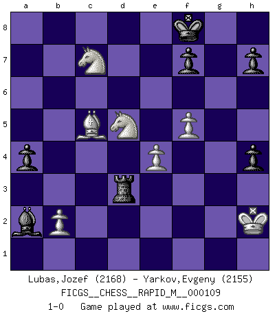 Last move : 1-0 2020 January 22 7:15:47 [Event "FICGS__CHESS__RAPID_M__000109"] [Site "FICGS"] [Date "2019.10.15"] [Round "1"] [White "Lubas,Jozef"] [Black "Yarkov,Evgeny"] [Result "1-0"] [WhiteElo "2168"] [BlackElo "2155"] 1.d4 d5 2.c4 Nf6 3.Nf3 e6 4.Nc3 c6 5.e3 Nbd7 6.Qc2 Bd6 7.Bd3 O-O 8.O-O dxc4 9.Bxc4 b5 10.Be2 Bb7 11.Rd1 Qc7 12.e4 e5 13.dxe5 Nxe5 14.Nd4 Neg4 15.Bxg4 Bxh2+ 16.Kf1 Nxg4 17.g3 b4 18.Nd5 Qd7 19.Nf4 Rfd8 20.Rd2 Qc7 21.Nf5 g6 22.Qc5 Qe5 23.Qxe5 Nxe5 24.Nd6 Nf3 25.Rd1 Bc8 26.Be3 Bg4 27.Kg2 Rd7 28.Nc4 Rxd1 29.Rxd1 g5 30.Nh3 Nh4+ 31.gxh4 Bxd1 32.Kxh2 gxh4 33.f4 Bc2 34.Nd6 a5 35.Bc5 Bb1 36.f5 Bxa2 37.Nf4 a4 38.Bxb4 Rb8 39.Ba3 Rb3 40.Ne8 c5 41.Nd5 Kf8 42.Nec7 Rd3 43.Bxc5+ 1-0 QGD : Marshall defense Kingside Castling by player Black (move 7) Kingside Castling by player White (move 8) Player White won this chess game. Follow this game move after move (download)Fischer is the strongest player in the world. In fact, the strongest player who ever lived. (Larry Evans) Wenn ich gewinne bin ich ein Genie. Wenn nicht, dann bin ich keines. (Robert James Fischer) Hoy en día, si tu no eres un Gran Maestro a los 14 años, es mejor que lo olvides. (Anand Viswanathan) La vérité est comme le meilleur coup aux échecs : elle existe, mais il faut la chercher. (Arturo Perez-Reverte) O divine art of subtlety and secrecy! Through you we learn to be invisible, through you inaudible and hence we can hold the enemy's fate in our hands. (Sun Tzu)