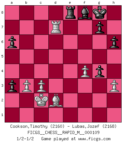 Last move : 1/2-1/2 2019 November 11 3:55:7 [Event "FICGS__CHESS__RAPID_M__000109"] [Site "FICGS"] [Date "2019.10.15"] [Round "1"] [White "Cookson,Timothy"] [Black "Lubas,Jozef"] [Result "1/2-1/2"] [WhiteElo "2160"] [BlackElo "2168"] 1.e4 c5 2.Nf3 d6 3.d4 cxd4 4.Nxd4 Nf6 5.Nc3 a6 6.Be3 e6 7.f3 b5 8.a3 Bb7 9.g4 h6 10.Qd2 Nc6 11.O-O-O d5 12.Nxc6 Bxc6 13.exd5 Nxd5 14.Nxd5 Bxd5 15.Bg2 b4 16.f4 bxa3 17.b3 Be7 18.Bxd5 exd5 19.Qxd5 O-O 20.Qe5 Qe8 21.Bd4 f6 22.Qe6+ Rf7 23.Rhe1 Qc8 24.c3 Bb4 25.Re3 Qxe6 26.Rxe6 Rc7 27.Rd3 Bf8 28.Rd1 Rb7 29.Kc2 Kf7 30.Rb6 Rxb6 31.Bxb6 Rb8 32.Be3 f5 33.h3 Re8 34.Rd7+ Kg8 35.Bd2 fxg4 1/2-1/2 Sicilian : Najdorf, Byrne (English) attack Queenside Castling by player White (move 11) Kingside Castling by player Black (move 19) This chess game ended in a draw. Follow this game move after move (download)After black's reply to 1.e4 with 1..e5, leaves him always trying to get into the game. (Howard Staunton) Kann Schach nicht schließlich das Nationalspiel der Deutschen werden? Und welche weiteren Ausblicke bieten sich dann dar! Welche Hebung des allgemeinen Kultur-Niveaus, ja der Moral, wenn das Schachbrett den Kartentisch verdrängen würde! Wahrlich, ein Ziel, des Schweißes der Edlen wert! (Siegbert Tarrasch) Aquellos que dicen entender al Ajedrez, no entienden nada. (Robert Hubner) Nous sommes les pions de la mystérieuse partie d'Echecs jouée par Dieu. Il nous déplace, nous arrête, nous pousse encore, puis nous lance un à un dans la boîte du Néant. Epitaphe sur la tombe de David Janowsky (1868-1927). Don't anthropomorphize computers - they hate it. (Anonymous)