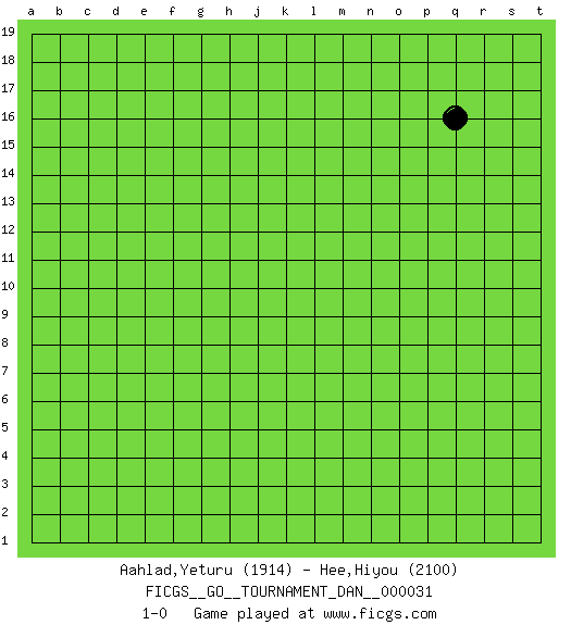 Last move : 1-0 2019 November 14 21:16:18 [Event "FICGS__GO__TOURNAMENT_DAN__000031"] [Site "FICGS"] [Date "2019.10.15"] [Round "1"] [Black "Aahlad,Yeturu"] [White "Hee,Hiyou"] [Result "1-0"] [Rating 1 "1914"] [Rating 2 "2100"] 1.q16 1-0 This go game has been lost on time (started : 2019.10.15 19:51:42) Here are the names of the openings (joseki) played in the four corners : Player Black won this Go (weiqi, baduk) game. Follow this game move after move (download)Extend one hand from the cutting points. (Anonymous) Every vice is only an exaggeration of a necessary and virtuous function. (Ralph Waldo Emerson, Journals 1936)