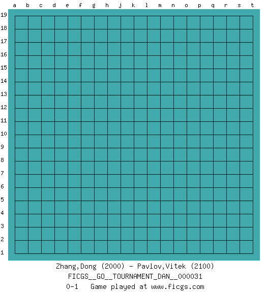 Last move : 0-1 2019 November 14 20:21:28 [Event "FICGS__GO__TOURNAMENT_DAN__000031"] [Site "FICGS"] [Date "2019.10.15"] [Round "1"] [Black "Zhang,Dong"] [White "Pavlov,Vitek"] [Result "0-1"] [Rating 1 "2000"] [Rating 2 "2100"] 0-1 This go game has been lost on time (started : 2019.10.15 19:51:42) Here are the names of the openings (joseki) played in the four corners : Player White won this Go (weiqi, baduk) game. Follow this game move after move (download)Josekis are not fixed, definitive things. They indicate the moments when everything can change. (Pierre Audouard) Wipe them out. All of them. (Darth Sidious in Star Wars ep.1)