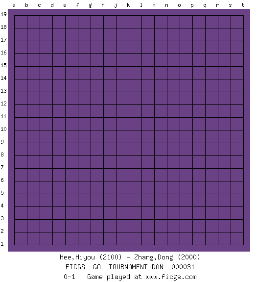 Last move : 0-1 2019 November 14 20:21:28 [Event "FICGS__GO__TOURNAMENT_DAN__000031"] [Site "FICGS"] [Date "2019.10.15"] [Round "1"] [Black "Hee,Hiyou"] [White "Zhang,Dong"] [Result "0-1"] [Rating 1 "2100"] [Rating 2 "2000"] 0-1 This go game has been lost on time (started : 2019.10.15 19:51:42) Here are the names of the openings (joseki) played in the four corners : Player White won this Go (weiqi, baduk) game. Follow this game move after move (download)Don't make compact groups of stones. (Anonymous) You have to believe in yourself. (Sun Tzu)