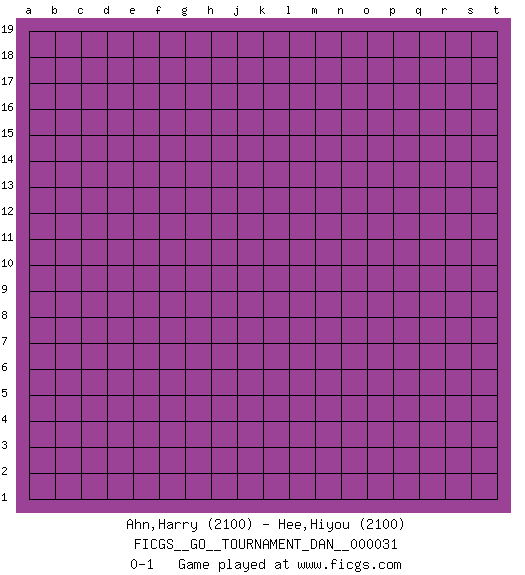 Last move : 0-1 2019 November 14 20:21:28 [Event "FICGS__GO__TOURNAMENT_DAN__000031"] [Site "FICGS"] [Date "2019.10.15"] [Round "1"] [Black "Ahn,Harry"] [White "Hee,Hiyou"] [Result "0-1"] [Rating 1 "2100"] [Rating 2 "2100"] 0-1 This go game has been lost on time (started : 2019.10.15 19:51:42) Here are the names of the openings (joseki) played in the four corners : Player White won this Go (weiqi, baduk) game. Follow this game move after move (download)Take the cutting stone on the second line. (Anonymous) He who is a good ruler must first have been ruled. (Aristotle)