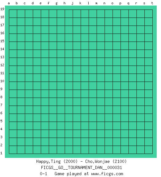 Last move : 0-1 2019 November 14 20:21:28 [Event "FICGS__GO__TOURNAMENT_DAN__000031"] [Site "FICGS"] [Date "2019.10.15"] [Round "1"] [Black "Happy,Ting"] [White "Cho,Wonjae"] [Result "0-1"] [Rating 1 "2000"] [Rating 2 "2100"] 0-1 This go game has been lost on time (started : 2019.10.15 19:51:42) Here are the names of the openings (joseki) played in the four corners : Player White won this Go (weiqi, baduk) game. Follow this game move after move (download)Ikken tobi is never wrong. (Anonymous) The real danger is not that computers will begin to think like men, but that men will begin to think like computers. (Sydney J. Harris)