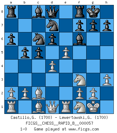 Last move : 1-0 2007 August 27 23:56:53 [Event "FICGS__CHESS__RAPID_B__000057"] [Site "FICGS"] [Date "2007.06.26"] [Round "1"] [White "Castillo,German"] [Black "Lewertowski,Gabriel"] [Result "1-0"] [WhiteElo "1700"] [BlackElo "1700"] 1.e4 e5 2.Nf3 Nc6 3.Bb5 a6 4.Ba4 Nf6 5.O-O Be7 6.Re1 b5 7.Bb3 d6 8.c3 O-O 9.h3 Na5 10.Bc2 c5 11.d4 Nd7 12.Nbd2 exd4 13.cxd4 Nc6 14.Nf1 Bf6 15.e5 1-0 Ruy Lopez : Closed Kingside Castling by player White (move 5) Kingside Castling by player Black (move 8) Player White won this chess game. Follow this game move after move (download)Blessed be the memory of him who gave the world this immortal game. (A. G. Gardiner) Die FIDE ist dabei in die Hände der russischen Mafia zu fallen. (Larry Evans) Cuando no sepas que mover, espera por una idea que se le venga a la la cabeza de tu oponente. Tenlo por seguro de que esa idea estará incorrecta. (Siegbert Tarrasch) Si je n'étais pas joueur d'échecs, je serais le meilleur dans quelque chose d'autre. (Anatoli Karpov) Everybody lies. (Gregory House, House M.D.)