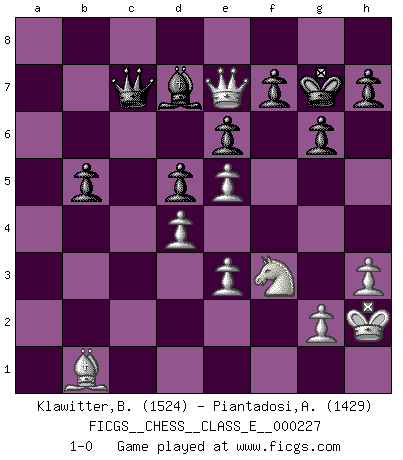 Last move : 1-0 2020 February 9 1:11:54 [Event "FICGS__CHESS__CLASS_E__000227"] [Site "FICGS"] [Date "2019.10.16"] [Round "1"] [White "Klawitter,Bernd"] [Black "Piantadosi,Angelo"] [Result "1-0"] [WhiteElo "1524"] [BlackElo "1429"] 1.e4 e6 2.d4 d5 3.e5 c5 4.c3 Nc6 5.Nf3 Qb6 6.a3 Bd7 7.Be2 cxd4 8.cxd4 Nge7 9.O-O Ng6 10.Nc3 Be7 11.Na4 Qc7 12.Nc3 O-O 13.Be3 a6 14.Rc1 Rac8 15.Na2 Qb8 16.Qd2 b5 17.b4 a5 18.Rxc6 Rxc6 19.Qb2 Rfc8 20.Bd3 axb4 21.Nxb4 Bxb4 22.Qxb4 Rc3 23.Be2 Qa8 24.Ra1 Rc2 25.Bd1 R2c4 26.Qb2 Ne7 27.Bb3 Rc3 28.Bd1 Nf5 29.h3 Nxe3 30.fxe3 Qc6 31.Qd2 Qa6 32.Kh2 Rxa3 33.Rxa3 Qb6 34.Qb4 g6 35.Be2 Qc6 36.Bd3 Qc1 37.Bb1 Kg7 38.Ra7 Rc7 39.Rxc7 Qxc7 40.Qe7 1-0 French : Advance, Paulsen attack Kingside Castling by player White (move 9) Kingside Castling by player Black (move 12) Player White won this chess game. Follow this game move after move (download)All that matters on the Chessboard is good moves. (Bobby Fischer) Im Blitz ist es einfacher mit einer Figur weniger anzugreifen, als sich mit einer Mehrfigur zu verteidigen. (Mikhail Nekhemyevich Tal) En partidas rápidas, el Caballo es mas poderoso que el Alfil. (Vlastimil Hort) C'est une question de caractère, Beaucoup de gens perdent leur motivation très vite. D'autres, ils sont rares, peuvent la conserver très longtemps. J'aime les échecs, encore aujourd'hui je suis heureux d'analyser des parties. J'aime toujours gagner, je déteste encore perdre. Bien jouer est important pour mon intégrité intellectuelle et morale. Et puis les échecs vivent en ce moment une période historique grâce à Internet. Ils se développent dans les systèmes éducatifs à travers le monde. Ils sortent de leur ghetto, et c'est mon rôle de mener à bien cette révolution. (Gary Kasparov) Bobby never cared about money, though. His only desire was to prove that his choices were correct: He wanted chess to be important because he was a chess player, and he wanted to be important. Bobby knew money was important, but he didn't have a clue why, outside of clothes and status. The only way he could accomplish what he wanted was to fight for a lot of money. Once he got it, he gave it away. He did not know how to spend it. And once he'd become champion, after, essentially, sacrificing his life for it, he didn't know how to spend his time. (Bob Wade)