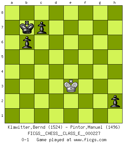 Last move : 0-1 2020 January 24 15:53:8 [Event "FICGS__CHESS__CLASS_E__000227"] [Site "FICGS"] [Date "2019.10.16"] [Round "1"] [White "Klawitter,Bernd"] [Black "Pintor,Manuel"] [Result "0-1"] [WhiteElo "1524"] [BlackElo "1496"] 1.e4 e5 2.Nf3 Nc6 3.Bb5 Qf6 4.Bxc6 dxc6 5.O-O Bg4 6.d3 h6 7.Nbd2 O-O-O 8.h3 Bh5 9.b3 Bb4 10.Bb2 Bxd2 11.Qxd2 Bxf3 12.gxf3 Qxf3 13.Qe3 Qh5 14.Kh2 Nf6 15.Rg1 g5 16.Qg3 Nd7 17.Qg4 Qxg4 18.Rxg4 f6 19.R4g1 h5 20.a4 h4 21.f3 a6 22.Bc1 Rhg8 23.Bd2 Nc5 24.Bb4 Nd7 25.Rg2 c5 26.Bd2 Nf8 27.Kg1 Ne6 28.Be3 b6 29.Kf2 Nd4 30.Bxd4 cxd4 31.Rc1 Rd6 32.Ke2 Rc6 33.Kd2 Rc3 34.b4 Ra3 35.c4 dxc3+ 36.Rxc3 Rxa4 37.Ke3 Rxb4 38.Rc6 Rf8 39.Rgc2 Rf7 40.Rd6 Kb7 41.R2c6 f5 42.Rf6 Rxf6 43.Rxf6 f4+ 44.Kd2 Rb2+ 45.Ke1 Rh2 46.Rg6 Rxh3 47.Rxg5 Rxf3 48.Ke2 Rg3 49.Rxe5 h3 50.Rh5 Re3+ 51.Kd2 Rg3 52.Ke2 a5 53.d4 a4 54.e5 a3 55.e6 a2 56.e7 a1Q 57.e8Q Qxd4 58.Re5 Re3+ 59.Rxe3 Qxe3+ 60.Qxe3 fxe3 61.Kxe3 h2 0-1 Ruy Lopez (Spanish Opening) Kingside Castling by player White (move 5) Queenside Castling by player Black (move 7) Promotion Queen by player Black (move 56) Promotion Queen by player White (move 57) 10 pieces endgame at move 57 : White KQR , Black KQRPPPP WHITE : King + 1 Queen 1 Rook BLACK : King + 1 Queen 1 Rook 4 Pawns 9 pieces endgame at move 59 : White KQR , Black KQPPPP WHITE : King + 1 Queen 1 Rook BLACK : King + 1 Queen 4 Pawns 8 pieces endgame at move 59 : White KQ , Black KQPPPP WHITE : King + 1 Queen BLACK : King + 1 Queen 4 Pawns 7 pieces endgame at move 60 : White KQ , Black KPPPP WHITE : King + 1 Queen BLACK : King + 4 Pawns 6 pieces endgame at move 60 : White K , Black KPPPP WHITE : King + BLACK : King + 4 Pawns 5 pieces endgame at move 61 : White K , Black KPPP WHITE : King + BLACK : King + 3 Pawns Player Black won this chess game. Follow this game move after move (download)The game of chess is the touchstone of the intellect. (Goethe) Man kann eine Schachpartie nur gewinnen, wenn das Gleichgewicht gestört ist. In einer Stellung mit ungestörtem Gleichgewicht ist auch das größte Genie hilflos - in der Stellung steckt dann eben kein genialer Einfall. (Wilhelm Steinitz) Yo tuve un dolor de muelas en la primer partida. En el segundo juego, tuve un dolor de cabeza. En el tercero, tuve un ataque de reumatísmo. En la cuarta partida, no me sentía muy bien. ¿Y en el quinto juego? Bueno, ¿que acaso uno tiene que ganar todos los juegos?. (Siegbert Tarrasch) Tous ces prétendus hommes politiques sont les pions, les Cavaliers, les Tours ou les Fous d'une partie d'échecs qui se jouera tant qu'un hasard ne renversera pas l'échiquier. (Honoré de Balzac) Big Chess is a place for big hallucinations. (Thibault de Vassal)