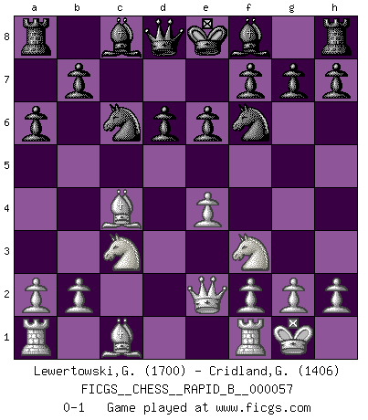 Last move : 0-1 2007 August 29 6:4:8 [Event "FICGS__CHESS__RAPID_B__000057"] [Site "FICGS"] [Date "2007.06.26"] [Round "1"] [White "Lewertowski,Gabriel"] [Black "Cridland,Graham"] [Result "0-1"] [WhiteElo "1700"] [BlackElo "1406"] 1.e4 c5 2.d4 cxd4 3.c3 dxc3 4.Nxc3 Nc6 5.Nf3 d6 6.Bc4 a6 7.O-O e6 8.Qe2 Nf6 0-1 This chess game has been lost on time (started : 2007.06.26 21:52:44) Sicilian : Smith-Morra gambit Kingside Castling by player White (move 7) Player Black won this chess game. Follow this game move after move (download)A Chess game is divided into three stages: the first, when you hope you have the advantage, the second when you believe you have an advantage, and the third... when you know you're going to lose ! (Savielly Tartakower) In der Schule lernt man nichts. Es ist nur Zeitverschwendung. (Robert James Fischer) Combinaciones deslumbrantes son para la mayoría, mover madera es para los pocos. (Georg Kieninger) Les échecs sont utiles à l'exercice de la faculté de penser et à celle de l'imagination. Car nous devons posséder une méthode élaborée pour atteindre des buts partout où nous devons conduire notre raison. (Leibnitz) The faster the computer, the slower the brain. (Thibault de Vassal)