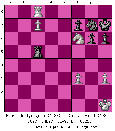 Last move : 1-0 2019 December 17 0:38:30 [Event "FICGS__CHESS__CLASS_E__000227"] [Site "FICGS"] [Date "2019.10.16"] [Round "1"] [White "Piantadosi,Angelo"] [Black "Gonet,Gerard"] [Result "1-0"] [WhiteElo "1429"] [BlackElo "1222"] 1.e4 d5 2.exd5 Nf6 3.d4 Bg4 4.Be2 Bxe2 5.Nxe2 Qxd5 6.Nbc3 Qh5 7.O-O e6 8.Ng3 Qxd1 9.Rxd1 Bb4 10.Bd2 O-O 11.Nce2 Nc6 12.c3 Bd6 13.Bf4 e5 14.dxe5 Bxe5 15.Bxe5 Nxe5 16.Nd4 Rad8 17.h3 c5 18.Nb5 Nd3 19.Nxa7 Nxb2 20.Rxd8 Rxd8 21.Rb1 Nc4 22.Rxb7 h6 23.Rc7 Rd1+ 24.Kh2 Rc1 25.Ne2 Rc2 26.Rxc5 Nd6 27.Nd4 Rxa2 28.Nab5 Nde4 29.Rc8+ Kh7 30.f3 Nd2 31.c4 Nf1+ 32.Kg1 Ne3 33.c5 Rxg2+ 34.Kh1 Nh5 35.Nf5 g6 36.Nxe3 Rg5 37.c6 Rxb5 38.c7 Rc5 39.Nd5 Ng7 40.Nf6+ 1-0 Scandinavian defense Kingside Castling by player White (move 7) Kingside Castling by player Black (move 10) Player White won this chess game. Follow this game move after move (download)Chess is in its essence a game, in its form an art, and in its execution a science. (Baron Tassilo) Zum Sieg gelangt man nicht, wenn man gut, sondern nur wenn man besser spielt (Savielly Grigorievitsch Tartakower) Las Aperturas te enseñan aperturas. ¡Los Finales te enseñan Ajedrez!. (Stephan Gerzadowicz) La vérité est comme le meilleur coup aux échecs : elle existe, mais il faut la chercher. (Arturo Perez-Reverte) Life is the sum of all your choices. (Albert Camus)