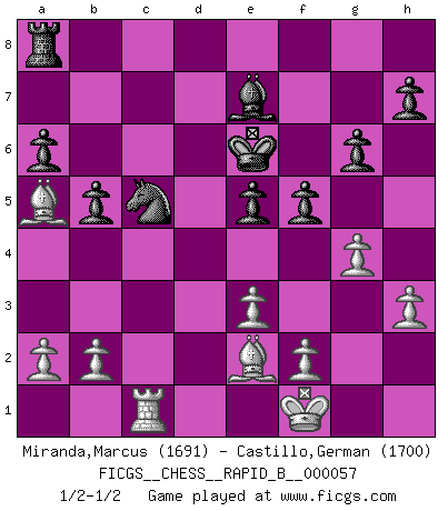 Last move : 1/2-1/2 2007 August 30 15:3:38 [Event "FICGS__CHESS__RAPID_B__000057"] [Site "FICGS"] [Date "2007.06.26"] [Round "1"] [White "Miranda,Marcus"] [Black "Castillo,German"] [Result "1/2-1/2"] [WhiteElo "1691"] [BlackElo "1700"] 1.d4 d5 2.c4 dxc4 3.Nf3 Nf6 4.e3 e6 5.Bxc4 c5 6.O-O a6 7.dxc5 Qxd1 8.Rxd1 Bxc5 9.Nbd2 O-O 10.Be2 Rd8 11.Ne5 Be7 12.Ndc4 Rxd1+ 13.Bxd1 Nbd7 14.Bd2 Ne4 15.Ba5 Nxe5 16.Nxe5 f6 17.Nc4 b5 18.Nb6 Rb8 19.Bb3 Kf7 20.Rc1 Nc5 21.Bc2 f5 22.g4 g6 23.Nxc8 Rxc8 24.Bd3 Ra8 25.Be2 e5 26.Kf1 Ke6 27.h3 1/2-1/2 QGA : Classical, 6...a6 Kingside Castling by player White (move 6) Kingside Castling by player Black (move 9) This chess game ended in a draw. Follow this game move after move (download)Chess is a forcing house where the fruits of character can ripen more fully than in life. (Edward Morgan Foster) Schach ist ein Kampf gegen den Fehler. (Johannes Herrman Zukertort) Es muy difícil jugar en contra de la teoría de Einstein. - en su primera derrota en contra de Fischer (Mikhail Tal) Avant la finale, les dieux ont créé le milieu de partie. (Tarrasch) Logic : The art of thinking and reasoning in strict accordance with the limitations and incapacities of the human misunderstanding. (Ambrose Bierce)