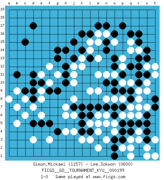 Last move : 1-0 2020 March 25 4:15:6 [Event "FICGS__GO__TOURNAMENT_KYU__000199"] [Site "FICGS"] [Date "2019.10.18"] [Round "1"] [Black "Simon,Mickael"] [White "Lee,Sokwon"] [Result "1-0"] [Rating 1 "1157"] [Rating 2 "0600"] 1.r16 q3 2.d17 d3 3.c15 k3 4.q5 r4 5.r5 q7 6.d5 d7 7.f5 e6 8.e5 f3 9.p17 b5 10.k16 r14 11.p3 p2 12.o3 n3 13.o2 q1 14.r2 q2 15.s4 r3 16.s3 s2 17.r1 s1 18.t2 t1 19.q4 h6 20.r12 t3 21.s5 s12 22.r11 s10 23.q9 s7 24.s11 t11 25.s13 t12 26.s14 r9 27.q8 r8 28.p7 p6 29.o7 q6 30.o6 o4 31.p4 o5 32.p5 n6 33.o1 m2 34.g4 h4 35.d11 j12 36.o9 n8 37.n7 m6 38.m7 m9 39.l6 m5 40.k7 j8 41.j7 h7 42.c9 c8 43.d9 e9 44.f9 e8 45.e10 f10 46.g9 e11 47.d10 g11 48.h10 j10 49.d8 c6 50.l4 l5 51.n4 n5 52.k5 m4 53.k4 l3 54.g14 p10 55.r10 s9 56.r13 p8 57.p9 o8 58.l7 l9 59.r7 r6 60.s6 r7 61.t8 j6 62.k6 j4 63.t7 q10 64.o10 o11 65.n10 m11 66.p11 p12 67.q12 p13 68.h11 f12 69.h12 h13 70.j13 j11 71.h14 k13 72.g13 j14 73.j15 l15 74.k14 l14 75.l16 m16 76.m17 n16 77.n17 q15 78.r15 q14 79.o16 o15 80.q16 b9 81.b8 b7 82.c7 a8 83.l13 k12 84.n15 m15 85.n14 m13 86.b11 c8 87.o12 n11 88.o13 1-0 Here are the names of the openings (joseki) played in the four corners : Corner q4 : q3 q5 Komoku (Somok, Xiao~mu`) 3-4 Point. The komoku (3-4) point is the traditional corner enclosure move.. Ikken Takagakari (Hankan Nop'dakeolch'im, Yi Gaogua`jiao~, 1-Space High Approach). The 5-4 approach move has become more popular in modern times, as modern Go emphasizes speed and influence. Corner d4 : d3 d5 Komoku (Somok, Xiao~mu`) 3-4 Point. The komoku (3-4) point is the traditional corner enclosure move.. Ikken Takagakari (Hankan Nop'dakeolch'im, Yi Gaogua`jiao~, 1-Space High Approach). The 5-4 approach move has become more popular in modern times, as modern Go emphasizes speed and influence. Player Black won this Go (weiqi, baduk) game. Follow this game move after move (download)White is always trying to kill a bigger group than black is trying to save. (Anonymous) It's not a bug - it's an undocumented feature. (Anonymous)