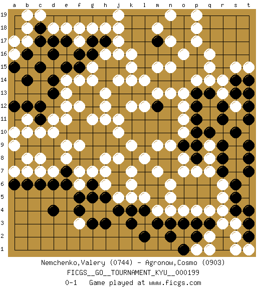 Last move : 0-1 2020 April 14 18:51:17 [Event "FICGS__GO__TOURNAMENT_KYU__000199"] [Site "FICGS"] [Date "2019.10.18"] [Round "1"] [Black "Nemchenko,Valery"] [White "Agronow,Cosmo"] [Result "0-1"] [Rating 1 "0744"] [Rating 2 "0903"] 1.d4 q16 2.d16 q4 3.q10 o10 4.p10 o12 5.p11 o11 6.p12 f3 7.f4 h4 8.k4 q8 9.r9 q9 10.p9 o8 11.o9 n9 12.p8 p7 13.r8 q7 14.r7 r10 15.r11 k5 16.j4 j5 17.h3 g4 18.g3 m4 19.l4 l5 20.m3 o4 21.n3 n4 22.o3 p4 23.p3 f17 24.f16 k16 25.j16 k15 26.j15 j14 27.h14 h13 28.j13 k14 29.k13 m13 30.l13 l14 31.m14 m15 32.n14 n13 33.o14 o13 34.p13 p14 35.o15 n15 36.p15 q14 37.q13 r13 38.r12 s12 39.s10 q15 40.p16 p17 41.o17 o16 42.m12 l12 43.g13 h12 44.j12 j11 45.g12 k12 46.n8 o7 47.n7 r6 48.s6 r5 49.s5 r4 50.s4 g11 51.f11 g14 52.h15 g15 53.g16 j17 54.h17 h16 55.f15 f14 56.f13 e14 57.e15 h18 58.g17 g18 59.e17 m9 60.m8 d15 61.f18 j16 62.g10 h11 63.h10 l8 64.l7 k7 65.l6 k6 66.m5 n6 67.m6 m7 68.h5 h6 69.g5 f6 70.f5 n5 71.g6 g7 72.e6 f7 73.e7 j10 74.h9 s11 75.d14 e13 76.c15 f12 77.e10 e11 78.f10 d10 79.d9 e9 80.d8 j8 81.f8 h8 82.g8 h7 83.j9 k9 84.d13 d11 85.c12 e12 86.c11 c10 87.c9 f9 88.g9 e8 89.g19 j18 90.h19 j19 91.f19 e18 92.e19 d18 93.d19 c19 94.d17 f17 95.q3 r3 96.r2 s9 97.t9 s8 98.t8 f18 99.c18 b18 100.c17 b11 101.b12 b10 102.b9 a9 103.a8 a10 104.a12 b17 105.b16 a16 106.a15 a17 107.b14 b19 108.s13 r14 109.s14 s15 110.t11 s7 111.t7 t12 112.t13 t15 113.t14 s12 114.t12 s3 115.t3 s2 116.q1 s1 117.r1 p1 118.p2 q2 119.o1 q1 120.t2 t1 121.t4 p18 122.n2 l3 123.l2 d7 124.d6 c7 125.c6 b7 126.b6 a7 127.a6 b8 128.k3 c8 129.o18 p19 130.o19 n17 131.n18 m18 132.m17 n19 0-1 Here are the names of the openings (joseki) played in the four corners : Corner d4 : d4 f3 Hoshi (Hwajeom, Seongjeom, Xingwei`) 4-4 Point. The star or hoshi (4-4) point, emphasizing influence at the potential expense of territory. Ikken Kakari (Hankan Keolch'im, Yi Gua`jiao~, 1-Space Low Approach). White 2 is the standard approach move to the 4-4. Corner d16 : d16 f17 Hoshi (Hwajeom, Seongjeom, Xingwei`) 4-4 Point. The star or hoshi (4-4) point, emphasizing influence at the potential expense of territory. Ikken Kakari (Hankan Keolch'im, Yi Gua`jiao~, 1-Space Low Approach). White 2 is the standard approach move to the 4-4. Player White won this Go (weiqi, baduk) game. Follow this game move after move (download)The comb formation is alive. (Anonymous) The obstacle is the path. (Zen proverb)