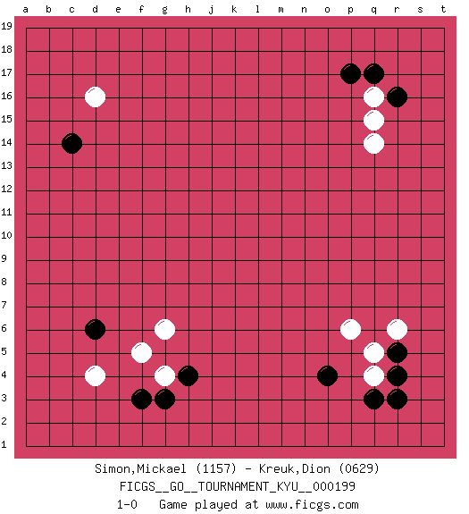 Last move : 1-0 2019 December 5 5:43:42 [Event "FICGS__GO__TOURNAMENT_KYU__000199 "] [Site "FICGS"] [Date "2019.10.18"] [Round "1"] [Black "Simon,Mickael "] [White "Kreuk,Dion "] [Result "1-0"] [Rating 1 "1157"] [Rating 2 "0629"] 1.r16 d16 2.q3 d4 3.p17 q5 4.r5 r6 5.r4 q4 6.r3 q14 7.d6 q16 8.q17 q15 9.o4 p6 10.f3 f5 11.h4 g4 12.g3 g6 13.c14 1-0 This go game has been lost on time (started : 2019.10.18 0:39:56) Here are the names of the openings (joseki) played in the four corners : Corner q4 : q3 q5Komoku (Somok, Xiao~mu`) 3-4 Point. The komoku (3-4) point is the traditional corner enclosure move..Ikken Takagakari (Hankan Nop'dakeolch'im, Yi Gaogua`jiao~, 1-Space High Approach). The 5-4 approach move has become more popular in modern times, as modern Go emphasizes speed and influence. Corner d4 : d4 d6Hoshi (Hwajeom, Seongjeom, Xingwei`) 4-4 Point. The star or hoshi (4-4) point, emphasizing influence at the potential expense of territory.Ikken Takagakari (Hankan Nop'dakeolch'im, Yi Gaojia, 1-Space High Approach). White typically responds at 6-4 or 3-10. White 4-10 is played when White finds play on the right side advantageous. White 4-8 or 3-8 may be played when White has support at top. Corner d16 : d16 c14Hoshi (Hwajeom, Seongjeom, Xingwei`) 4-4 Point. The star or hoshi (4-4) point, emphasizing influence at the potential expense of territory.Ikken Kakari (Hankan Keolch'im, Yi Gua`jiao~, 1-Space Low Approach). Black 2 is the standard approach move to the 4-4. Player Black won this Go (weiqi, baduk) game.Follow this game move after move (download ) In the sound of the stone you can hear its purpose. (Pierre Audouard) Fear is the path to the dark side. Fear leads to anger; anger leads to hate; hate leads to suffering. I sense much fear in you. (Master Yoda in Star Wars ep.1)