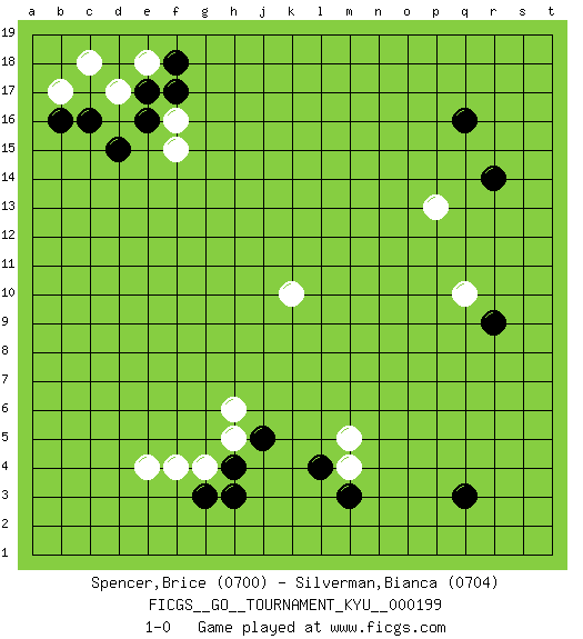 Last move : 1-0 2019 December 4 0:17:34 [Event "FICGS__GO__TOURNAMENT_KYU__000199"] [Site "FICGS"] [Date "2019.10.18"] [Round "1"] [Black "Spencer,Brice"] [White "Silverman,Bianca"] [Result "1-0"] [Rating 1 "0700"] [Rating 2 "0704"] 1.q16 e4 2.q3 d17 3.r9 q10 4.r14 k10 5.g3 g4 6.h4 f4 7.h3 h5 8.j5 h6 9.m3 m4 10.l4 m5 11.d15 p13 12.f17 f15 13.e16 f16 14.e17 e18 15.f18 c18 16.c16 b17 17.b16 1-0 This go game has been lost on time (started : 2019.10.18 0:39:56) Here are the names of the openings (joseki) played in the four corners : Corner d4 : e4 g3 Takamoku (Gomok, Gaomu`) 5-4 Point. The takamoku (high) point (5-4). With its emphasis on influence, the 5-4 point complements the 4-4 (hoshi) point in creating an influence-oriented fuseki. Corner d16 : d17 d15 Komoku (Somok, Xiao~mu`) 3-4 Point. The komoku (3-4) point is the traditional corner enclosure move.. Ikken Takagakari (Hankan Nop'dakeolch'im, Yi Gaogua`jiao~, 1-Space High Approach). The 5-4 approach move has become more popular in modern times, as modern Go emphasizes speed and influence. Player Black won this Go (weiqi, baduk) game. Follow this game move after move (download)Play slow, win slow; play fast, lose fast. (Anonymous) The hypothalamus is one of the most important parts of the brain, involved in many kinds of motivation, among other functions. The hypothalamus controls the 'Four Fs: Fighting, Fleeing, Feeding and Mating. (Unknown author)
