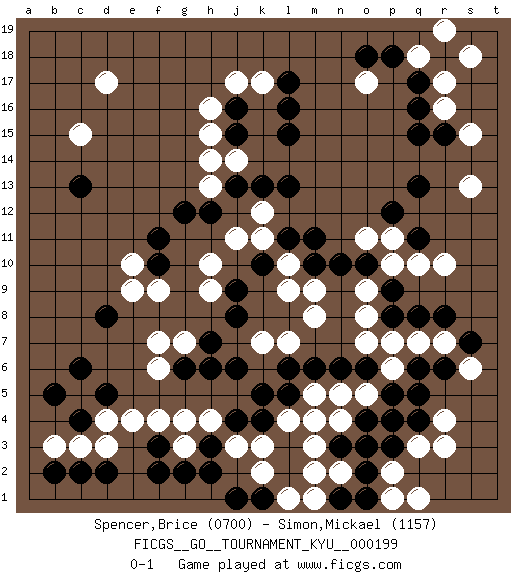 Last move : 0-1 2019 November 13 21:24:26 [Event "FICGS__GO__TOURNAMENT_KYU__000199"] [Site "FICGS"] [Date "2019.10.18"] [Round "1"] [Black "Spencer,Brice"] [White "Simon,Mickael"] [Result "0-1"] [Rating 1 "0700"] [Rating 2 "1157"] 1.q16 d4 2.q4 d17 3.f3 c15 4.k4 o17 5.l17 r17 6.q17 r16 7.q15 q18 8.r15 s15 9.r18 s18 10.p18 r19 11.o18 s13 12.q13 r3 13.r6 q3 14.p4 j17 15.j16 h16 16.j15 h15 17.d5 j14 18.l15 k17 19.l16 e4 20.d2 c3 21.c2 b3 22.b5 f4 23.d8 g3 24.f2 g4 25.b2 r10 26.c13 c5 27.c6 f7 28.c4 d3 29.g2 j3 30.j1 k3 31.p3 p2 32.o2 q1 33.n3 r4 34.q6 p11 35.l13 l10 36.q11 q10 37.p12 o11 38.k10 k11 39.l11 j11 40.m10 l9 41.m11 m9 42.n10 o8 43.p9 p10 44.p8 o9 45.o10 p7 46.q8 q7 47.r8 r7 48.s7 o7 49.j13 h14 50.g12 h13 51.h12 k12 52.k13 h10 53.j9 h9 54.j8 e9 55.f10 e10 56.f11 f9 57.h7 l4 58.l5 m5 59.l3 m4 60.k5 g7 61.g6 f6 62.h6 m8 63.m6 n5 64.n6 m3 65.l2 m2 66.k1 o5 67.o6 p6 68.p5 l7 69.l6 m1 70.n1 l1 71.h2 k2 72.h3 h4 73.j4 k7 74.j6 n2 75.o1 o3 76.o4 p1 77.o3 n4 78.q5 s6 0-1 Here are the names of the openings (joseki) played in the four corners : Corner d4 : d4 f3 Hoshi (Hwajeom, Seongjeom, Xingwei`) 4-4 Point. The star or hoshi (4-4) point, emphasizing influence at the potential expense of territory. Ikken Kakari (Hankan Keolch'im, Yi Gua`jiao~, 1-Space Low Approach). Black 2 is the standard approach move to the 4-4. Corner q16 : q16 o17 Hoshi (Hwajeom, Seongjeom, Xingwei`) 4-4 Point. The star or hoshi (4-4) point, emphasizing influence at the potential expense of territory. Ikken Kakari (Hankan Keolch'im, Yi Gua`jiao~, 1-Space Low Approach). White 2 is the standard approach move to the 4-4. Corner q4 : q4 r3 Hoshi (Hwajeom, Seongjeom, Xingwei`) 4-4 Point. The star or hoshi (4-4) point, emphasizing influence at the potential expense of territory. Player White won this Go (weiqi, baduk) game. Follow this game move after move (download)The rectangular six is normally alive. (Anonymous) Life is verb, not a noun. (Charlotte Perkins Gilman)