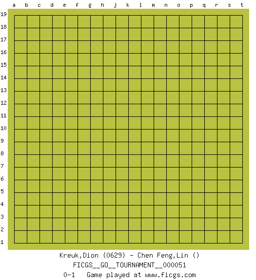 Last move : 0-1 2019 November 18 4:2:28 [Event "FICGS__GO__TOURNAMENT__000051"] [Site "FICGS"] [Date "2019.10.18"] [Round "1"] [Black "Kreuk,Dion"] [White "Chen Feng,Lin"] [Result "0-1"] [Rating 1 "0629"] 0-1 This go game has been lost on time (started : 2019.10.18 22:4:35) Here are the names of the openings (joseki) played in the four corners : Player White won this Go (weiqi, baduk) game. Follow this game move after move (download)Keep away from thickness. (Anonymous) Man is reluctant to give credit for intelligence to anyone, except his enemies. (Albert Einstein)