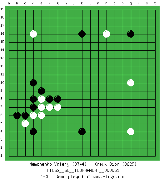 Last move : 1-0 2019 December 5 5:43:42 [Event "FICGS__GO__TOURNAMENT__000051"] [Site "FICGS"] [Date "2019.10.18"] [Round "1"] [Black "Nemchenko,Valery"] [White "Kreuk,Dion"] [Result "1-0"] [Rating 1 "0744"] [Rating 2 "0629"] 1.d4 d16 2.q16 q4 3.d10 q10 4.k16 n16 5.k4 g7 6.f8 f7 7.g8 e8 8.e9 e6 9.d8 e7 10.d7 d6 11.c6 c5 12.b6 1-0 This go game has been lost on time (started : 2019.10.18 22:4:35) Here are the names of the openings (joseki) played in the four corners : Corner q16 : q16 n16 Hoshi (Hwajeom, Seongjeom, Xingwei`) 4-4 Point. The star or hoshi (4-4) point, emphasizing influence at the potential expense of territory. Niken Takagakari (Dukan Nop'dakeolch'im, E`r Gaojia, 2-Space High Approach). White 2 is a light approach move. Rarely played in even games, White 2 is typically employed in handicap games. Black continues with 6-4 or 3-10. In Korean Sunjang Baduk Black has a stone on 8-4. Corner d4 : d4 g7 Hoshi (Hwajeom, Seongjeom, Xingwei`) 4-4 Point. The star or hoshi (4-4) point, emphasizing influence at the potential expense of territory. Player Black won this Go (weiqi, baduk) game. Follow this game move after move (download)Strange things happen at the one-two points. (Anonymous) Vladimir Ras-Putin is still alive... He is also a good actor, I saw him in the Lord of the Rings. (Rodolfo d'Ettorre)