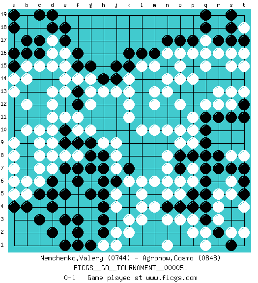 Last move : 0-1 2020 April 27 6:42:19 [Event "FICGS__GO__TOURNAMENT__000051"] [Site "FICGS"] [Date "2019.10.18"] [Round "1"] [Black "Nemchenko,Valery"] [White "Agronow,Cosmo"] [Result "0-1"] [Rating 1 "0744"] [Rating 2 "0848"] 1.d4 q16 2.q4 d16 3.k16 k14 4.j15 q8 5.q10 o10 6.q9 p9 7.q11 p10 8.p12 o14 9.p13 p14 10.o13 n13 11.n12 m12 12.n11 n10 13.m11 l10 14.l11 k11 15.l12 k12 16.l13 m13 17.l14 l15 18.m14 n14 19.o11 g14 20.j14 k13 21.k15 p11 22.q13 m15 23.l16 m10 24.p8 o12 25.q14 q15 26.r15 r16 27.s14 s15 28.r14 t15 29.t14 c6 30.d6 d7 31.d5 d10 32.e7 f8 33.f7 e8 34.g7 j7 35.h7 p7 36.o8 n7 37.o7 o6 38.q7 p6 39.r8 r12 40.q6 n8 41.m16 j13 42.h14 h13 43.g15 f14 44.f15 e15 45.f16 e16 46.e17 d17 47.e18 n16 48.n17 o16 49.o17 p16 50.p17 q17 51.q18 o15 52.r17 s16 53.s17 r18 54.s18 r19 55.q19 t18 56.t17 t16 57.s19 o9 58.q8 q12 59.r11 s12 60.s11 t13 61.t11 r13 62.t12 s13 63.p5 o5 64.o4 n6 65.n4 m4 66.m3 l3 67.n2 l4 68.l2 k2 69.k1 l1 70.m1 j1 71.l1 j2 72.j6 k6 73.k7 j8 74.k5 l6 75.h5 l5 76.k4 k3 77.h4 j4 78.h3 j5 79.h6 m6 80.h2 h1 81.g1 g2 82.f1 e2 83.f2 g3 84.f3 f4 85.e3 d3 86.d2 e4 87.e1 g4 88.c3 c7 89.c5 b5 90.b4 a5 91.a4 b6 92.h8 h9 93.g9 j9 94.g8 g10 95.f9 f10 96.e9 d8 97.d18 c18 98.c19 b19 99.d19 b18 100.e14 e13 101.d14 c15 102.c14 b14 103.c13 d9 104.e10 e11 105.b13 a13 106.a12 a14 107.b11 b10 108.a10 c10 109.b9 d13 110.c12 d11 111.c11 d12 112.b8 a8 113.a9 a7 114.b7 a6 115.c17 d15 116.b17 a17 117.b16 b15 118.a16 c8 119.f13 g13 120.f12 f11 121.a18 c9 122.a19 a11 123.a10 a9 124.a11 b12 125.a15 g6 126.g5 f5 127.f6 g12 128.c16 e14 129.e5 p3 130.p4 o3 131.o2 n3 132.m2 p2 133.p1 q1 134.o1 n1 135.q3 q2 136.r2 r3 137.s3 r4 138.s4 r5 139.q5 s2 140.t3 s5 141.t5 t2 142.s1 t4 143.t6 s8 144.s7 s6 145.t7 t8 146.r7 n5 0-1 Here are the names of the openings (joseki) played in the four corners : Corner d16 : d16 j15 Hoshi (Hwajeom, Seongjeom, Xingwei`) 4-4 Point. The star or hoshi (4-4) point, emphasizing influence at the potential expense of territory. Corner q4 : q4 q8 Hoshi (Hwajeom, Seongjeom, Xingwei`) 4-4 Point. The star or hoshi (4-4) point, emphasizing influence at the potential expense of territory. Corner q16 : q16 q11 Hoshi (Hwajeom, Seongjeom, Xingwei`) 4-4 Point. The star or hoshi (4-4) point, emphasizing influence at the potential expense of territory. Corner d4 : d4 c6 Hoshi (Hwajeom, Seongjeom, Xingwei`) 4-4 Point. The star or hoshi (4-4) point, emphasizing influence at the potential expense of territory. Ikken Kakari (Hankan Keolch'im, Yi Gua`jiao~, 1-Space Low Approach). White 2 is the standard approach move to the 4-4. Player White won this Go (weiqi, baduk) game. Follow this game move after move (download)Error is one of the sources of transformation. (Pierre Audouard) Games, world of games... There's always an opponent, and there's always a victim. (Revolver, movie)