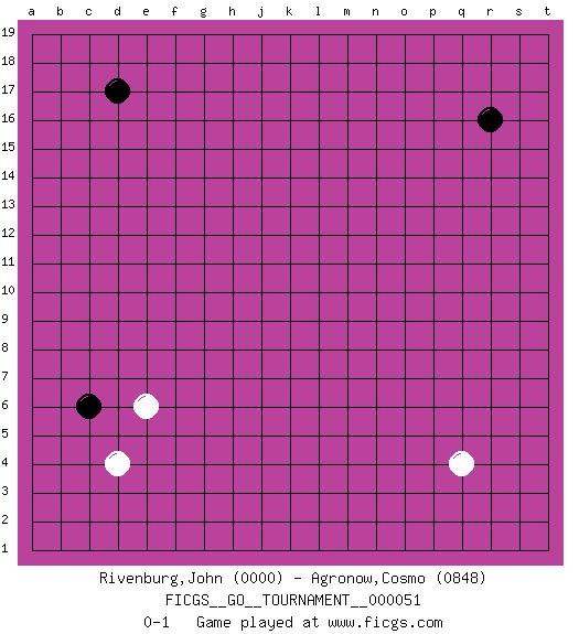 Last move : 0-1 2019 November 22 13:36:23 [Event "FICGS__GO__TOURNAMENT__000051"] [Site "FICGS"] [Date "2019.10.18"] [Round "1"] [Black "Rivenburg,John"] [White "Agronow,Cosmo"] [Result "0-1"] [Rating 1 "0000"] [Rating 2 "0848"] 1.r16 d4 2.d17 q4 3.c6 e6 0-1 This go game has been lost on time (started : 2019.10.18 22:4:35) Here are the names of the openings (joseki) played in the four corners : Corner d4 : d4 c6 Hoshi (Hwajeom, Seongjeom, Xingwei`) 4-4 Point. The star or hoshi (4-4) point, emphasizing influence at the potential expense of territory. Ikken Kakari (Hankan Keolch'im, Yi Gua`jiao~, 1-Space Low Approach). Black 2 is the standard approach move to the 4-4. Player White won this Go (weiqi, baduk) game. Follow this game move after move (download)Balance is not what players strike for, and if it does arise, it is in spite of them. (Pierre Audouard) If you have any trouble condescending, find a Unix user to show you how it's done. (Scott Adams)