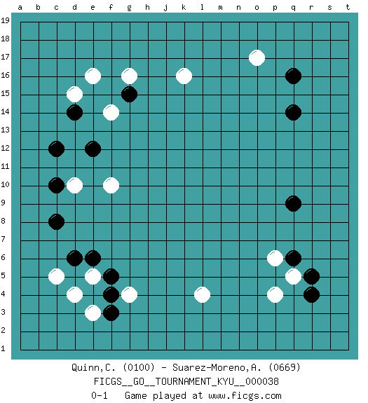 Last move : 0-1 2007 August 25 17:32:56 [Event "FICGS__GO__TOURNAMENT_KYU__000038 "] [Site "FICGS"] [Date "2007.06.27"] [Round "1"] [Black "Quinn,Connor "] [White "Suarez-Moreno,Alejandro "] [Result "0-1"] [Rating 1 "0100"] [Rating 2 "0669"] 1.q16 e16 2.r4 d4 3.f3 e3 4.f5 p4 5.q6 q5 6.r5 p6 7.q9 l4 8.d6 e5 9.e6 d10 10.d14 d15 11.c12 o17 12.q14 k16 13.e12 g4 14.f4 c5 15.g15 g16 16.c8 f10 17.c10 f14 0-1 This go game has been lost on time (started : 2007.06.27 9:16:58) Here are the names of the openings (joseki) played in the four corners : Corner d4 : d4 f3Hoshi (Hwajeom, Seongjeom, Xingwei`) 4-4 Point. The star or hoshi (4-4) point, emphasizing influence at the potential expense of territory.Ikken Kakari (Hankan Keolch'im, Yi Gua`jiao~, 1-Space Low Approach). Black 2 is the standard approach move to the 4-4. Corner q4 : r4 p4Komoku (Somok, Xiao~mu`) 3-4 Point. The komoku (3-4) point is the traditional corner enclosure move..Ikken Takagakari (Hankan Nop'dakeolch'im, Yi Gaogua`jiao~, 1-Space High Approach). The 5-4 approach move has become more popular in modern times, as modern Go emphasizes speed and influence. Corner d16 : e16 d14Takamoku (Gomok, Gaomu`) 5-4 Point. The takamoku (high) point (5-4). With its emphasis on influence, the 5-4 point complements the 4-4 (hoshi) point in creating an influence-oriented fuseki. Corner q16 : q16 o17Hoshi (Hwajeom, Seongjeom, Xingwei`) 4-4 Point. The star or hoshi (4-4) point, emphasizing influence at the potential expense of territory.Ikken Kakari (Hankan Keolch'im, Yi Gua`jiao~, 1-Space Low Approach). White 2 is the standard approach move to the 4-4. Player White won this Go (weiqi, baduk) game.Follow this game move after move (download ) A meijin needs no joseki. (Anonymous) Winning isn't everything... but losing is nothing. (Mednis)