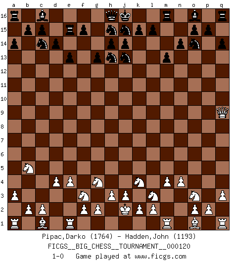 Last move : 1-0 2019 December 21 19:44:5 [Event "FICGS__BIG_CHESS__TOURNAMENT__000120"] [Site "FICGS"] [Date "2019.10.19"] [Round "1"] [White "Pipac,Darko"] [Black "Hadden,John"] [Result "1-0"] [WhiteElo "1764"] [BlackElo "1193"] 1.j2-k4 k16-l14 2.h2-g4 g16-f14 3.k1-l3 n15-n14 4.g1-f3 a15-a14 5.d2-d4 b16-c14 6.e2-e4 d15-d14 7.n2-n4 p16-o14 8.m2-m4 m15-m13 9.a2-a3 l16-m15 10.q2-q3 e15-e13 11.p1-o3 q15-q14 12.b1-c3 l14-j13 13.l1-p5 f16-e15 14.f1-b5 m15-b5 15.c3-b5 f14-h13 16.p5-e15 e16-e15 17.h1-q9 g15-g13 18.j1-j2 1-0 This big chess game has been lost on time (started : 2019.10.19 14:17:30) Follow this game move after move (download)A good sacrifice is one that is not necessarily sound but leaves your opponent dazed and confused. (Rudolph Spielmann) Frage des Reporters: -Worin besteht das Ziel von Gambiteröffnungen? Antwort: -Auf Kosten der Partie einen Ruf als Angriffspieler zu erwerben.- (Siegbert Tarrasch) Prefiero perder una partida realmente buena, que ganar una mala. (David Levy) Pour se monter efficace, un Cavalier a besoin d'avant-postes ! Les Cavaliers font les meilleurs bloqueurs de pions passés. War is the child of passion, passion is the child of narcissism and narcissism is the child. (...) Another game ? (Thibault de Vassal)