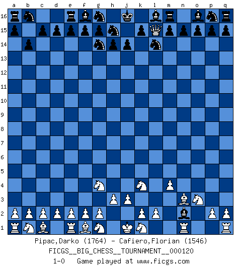 Last move : 1-0 2019 October 28 13:0:8 [Event "FICGS__BIG_CHESS__TOURNAMENT__000120"] [Site "FICGS"] [Date "2019.10.19"] [Round "1"] [White "Pipac,Darko"] [Black "Cafiero,Florian"] [Result "1-0"] [WhiteElo "1764"] [BlackElo "1546"] 1.j2-k4 j15-g14 2.h2-g4 h16-o10 3.m2-m4 o10-o2 4.p1-o3 b15-b14 5.h1-k3 c16-a14 6.l1-n3 a14-l4 7.k3-l3 o2-o1 8.m1-o1 l4-n2 9.l3-l15 k16-l14 10.o1-n1 1-0 Follow this game move after move (download)The King is a fighting piece. Use it ! (Wilhelm Steinitz) Ein Großmeister muß tausende Partien in seinem Kopf speichern, denn diese sind für Ihn, was die Worte der Muttersprache für gewöhnliche Leute sind, oder Noten für Musiker... (Garry Kasparov) La vida es como el Ajedrez, con lucha, competición y eventos buenos y malos. (Benjamin Franklin) Donnez-moi un Cavalier en 6e et je gagnerais toutes mes parties. (Steinitz) The ego is not master in its own house. (Sigmund Freud)