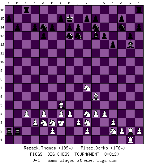 Last move : 0-1 2019 December 7 12:38:43 [Event "FICGS__BIG_CHESS__TOURNAMENT__000120"] [Site "FICGS"] [Date "2019.10.19"] [Round "1"] [White "Rezack,Thomas"] [Black "Pipac,Darko"] [Result "0-1"] [WhiteElo "1394"] [BlackElo "1764"] 1.m2-m4 k16-l14 2.g2-g4 g16-f14 3.l1-o4 h15-j13 4.h1-b7 j15-h13 5.o4-c15 h16-m12 6.c2-c3 b16-c14 7.n2-n3 d15-d14 8.g1-f3 m12-g12 9.b7-a8 g12-e12 10.a8-e12 f14-e12 11.k1-l3 e15-e13 12.o1-b13 c16-d15 13.b13-c14 d15-c14 14.c15-a13 e12-c13 15.a13-k4 c14-p2 16.p1-n2 p2-q1 17.m1-q1 f16-e15 18.q1-p1 b15-b14 19.d2-d3 n15-n13 20.b1-d2 m15-m13 21.e2-e4 c13-e14 22.d2-c4 p16-o14 23.c1-p13 o16-n15 24.h3-h4 q15-q14 25.p13-g5 p15-p13 26.f1-p10 l16-p12 27.l3-j4 j16-j15 28.p10-l6 a16-c16 29.h2-k3 c16-c12 30.k4-p9 j15-h15 31.j4-h6 e16-c16 32.j1-h2 n13-n12 33.p1-p2 e15-j11 34.j2-k4 f15-f14 35.c4-e3 c12-b12 36.h6-k7 n15-l13 37.p9-l13 j11-l13 38.l2-l4 c16-c12 39.e1-p1 b12-b2 40.h2-g3 m16-c16 41.c3-c4 c12-a12 42.a2-a3 a12-a3 43.f3-e1 a3-a1 44.e1-f3 a1-a2 0-1 Follow this game move after move (download)Every Chess master was once a beginner. (Chernev) Nie in meinem Leben habe ich die französische Verteidigung gespielt, welche die Stumpfsinnigste von allen ist. (Wilhelm Steinitz) Realmente no sabemos como el juego fue inventado, aunque hay sospechas. Tan pronto como descubramos a los culpables, se los haremos saber. (Bruce Pandolfini) Lorsque vous vous retrouvez devant une position atroce, ne tendez pas un ultime piège dérisoire avec l'intention d'abandonner si l'adversaire le déjoue ! Faites-vous plutôt un devoir de résister comme si votre vie en dépendait. Jouez le coup qui vous déplairait au centuple si vous étiez dans la peau de votre tortionnaire ! There's always a bigger fish. (Qui-Gon Jinn in Star Wars ep.1)