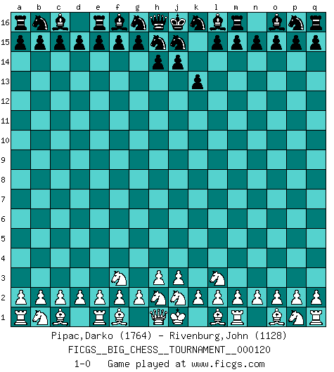 Last move : 1-0 2019 November 22 1:3:51 [Event "FICGS__BIG_CHESS__TOURNAMENT__000120"] [Site "FICGS"] [Date "2019.10.19"] [Round "1"] [White "Pipac,Darko"] [Black "Rivenburg,John"] [Result "1-0"] [WhiteElo "1764"] [BlackElo "1128"] 1.k1-l3 k15-k13 2.g1-f3 1-0 This big chess game has been lost on time (started : 2019.10.19 14:17:30) Follow this game move after move (download)In blitz, the Knight is stronger than the Bishop. (Vlastimil Hort) Das Spiel gibt uns die Genugtuung, die das Leben uns versagt. (Emanuel Lasker) El Ajedrez es un terrible juego. Si no controlas el centro, tu oponente tiene una posición mas holgada. Si tienes control del centro, ¡entonces realmente tu tienes algo de que preocuparte!. (Siegbert Tarrasch) L'ordinateur a tué l'originalité. Il n'y a plus guère d'aventures sur l'échiquier. (Jacob Murray) I can't decide which is riskier; taking crazy risks, or taking advice on crazy risks from a crazy risk taker. (Gregory House in House M.D.)