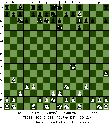 Last move : 1-0 2019 December 12 12:5:42 [Event "FICGS__BIG_CHESS__TOURNAMENT__000120"] [Site "FICGS"] [Date "2019.10.19"] [Round "1"] [White "Cafiero,Florian"] [Black "Hadden,John"] [Result "1-0"] [WhiteElo "1546"] [BlackElo "1193"] 1.j2-k4 n15-n14 2.h1-o7 j15-g14 3.o7-o15 k16-l14 4.o15-o4 d15-d14 5.c2-c3 p16-o14 6.d2-d4 m15-m13 7.n2-n4 m16-n16 8.e2-e4 g16-f14 9.f1-b5 l16-m15 10.o1-f9 n16-m16 11.m2-m3 b16-c14 12.o4-l7 o16-m14 13.l1-q6 l14-j13 14.c1-p13 q15-q14 15.p13-o14 p15-o14 16.f9-m15 1-0 This big chess game has been lost on time (started : 2019.10.19 14:17:30) Follow this game move after move (download)One bad move nullifies forty good ones. (Horowitz) Wer der Ansicht ist, daß alle Schachspieler verrückt sind, wird durch Studium des Lebens von Emil Josef Diemer nicht auf andere Gedanken kommen. (Hans Ree) Coloca el contenido de las piezas del Ajedrez en un sombrero, agitalo vigorosamente, arrojalas en un tablero desde una altura de 30 centimetros y así obtendras el estilo de Steinitz. (H. E. Bird) Les échecs, c'est l'imagination. (David Bronstein) Optimism is a variety of information deficit. Sometimes especially true for correspondence chess games. (Michael Aigner)