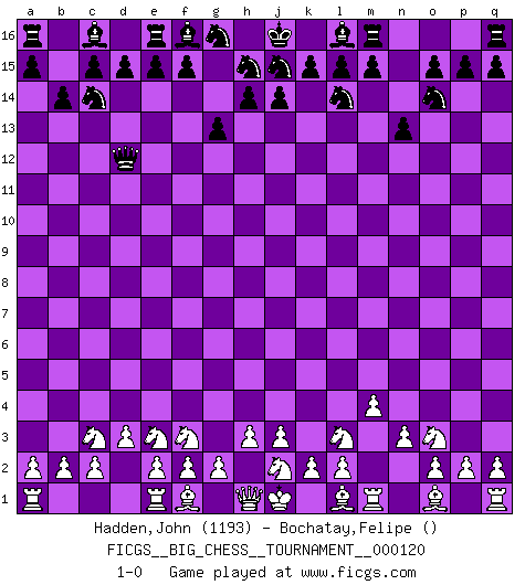 Last move : 1-0 2019 December 26 22:15:50 [Event "FICGS__BIG_CHESS__TOURNAMENT__000120"] [Site "FICGS"] [Date "2019.10.19"] [Round "1"] [White "Hadden,John"] [Black "Bochatay,Felipe"] [Result "1-0"] [WhiteElo "1193"] [BlackElo ""] 1.g1-f3 g15-g13 2.p1-o3 h16-d12 3.n2-n3 b16-c14 4.d2-d3 n15-n13 5.m2-m4 o16-c5 6.h2-g4 p16-o14 7.c1-e3 c5-e3 8.g4-e3 k16-l14 9.b1-c3 b15-b14 10.k1-l3 1-0 This big chess game has been lost on time (started : 2019.10.19 14:17:30) Follow this game move after move (download)A Chess game is a dialogue, a conversation between a player and his opponent. Each move by the opponent may contain threats or be a blunder, but a player cannot defend against threats or take advantage of blunders if he does not first ask himself: What is my opponent planning after each move ? (Bruce A. Moon) Aljechin war kein Nazi. Er war ein Opportunist. Ein schrecklicher Mann. Er liebte Geld über alles und würde für Geld ein Jude, ein Katolik oder ein Protestant werden. (Miguel Najdorf) Una clavada es mas poderosa que una espada. (Fred Reinfeld) Votre prénom est 'Tactique', votre deuxième prénom est 'Tactique' et votre nom est 'Tactique'. (Ken Smith) Art disturbs, science reassures. (Georges Braque, Le Jour et la Nuit)