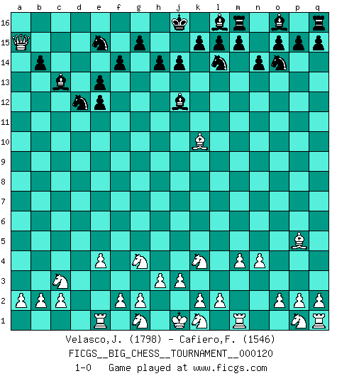 Last move : 1-0 2019 October 28 17:14:1 [Event "FICGS__BIG_CHESS__TOURNAMENT__000120"] [Site "FICGS"] [Date "2019.10.19"] [Round "1"] [White "Velasco,Jose Maria"] [Black "Cafiero,Florian"] [Result "1-0"] [WhiteElo "1798"] [BlackElo "1546"] 1.j2-k4 j15-k13 2.h1-o7 h15-g13 3.m2-m4 p16-o14 4.l1-p5 n15-n14 5.d2-d4 d15-d14 6.c1-l9 f15-f14 7.o7-e16 b16-d15 8.e16-o7 e15-e13 9.e2-e4 d14-d13 10.f1-b5 h16-l13 11.b1-c3 l13-b4 12.a1-b1 b4-d4 13.h2-g4 k13-m12 14.l9-k10 d4-d12 15.b1-d1 d12-e12 16.n2-n4 d15-c13 17.b5-f9 c16-h11 18.f9-d11 c13-d11 19.o1-d11 h11-j12 20.d11-e12 d13-e12 21.o7-b7 b15-b14 22.k10-m12 k16-l14 23.m12-k10 f16-a11 24.d1-d15 g16-e15 25.d15-c15 g13-e14 26.c15-d15 e14-d12 27.b7-a8 a11-c13 28.d15-a15 a16-a15 29.a8-a15 1-0 Follow this game move after move (download)Pawn endings are to Chess what putting is to golf. (Cecil Purdy) Ich hatte Angst gegen einen russischen Großmeister zu verlieren, und er befürchtete gegen einen kleinen Jungen zu verlieren. (über ein Remis gegen Juri Awerbach). (Robert James Fischer) Puntos débiles o agujeros en la posición de tu oponente deben de ser ocupados por piezas, no Peones. (Siegbert Tarrasch) Des combinaisons [dans le jeu d'échecs] pareilles à des mélodies. Je crois entendre pour ainsi dire la musique des coups... (Vladimir Nabokov) The various flowers seem good to different people. (Chinese proverb)