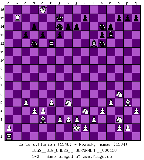 Last move : 1-0 2019 December 5 18:29:29 [Event "FICGS__BIG_CHESS__TOURNAMENT__000120"] [Site "FICGS"] [Date "2019.10.19"] [Round "1"] [White "Cafiero,Florian"] [Black "Rezack,Thomas"] [Result "1-0"] [WhiteElo "1546"] [BlackElo "1394"] 1.j2-k4 n15-n14 2.h1-o7 g15-g13 3.o7-f15 e16-d16 4.f15-l10 b16-c14 5.l10-l15 o16-n15 6.l15-p11 n15-o14 7.d2-d3 d15-d14 8.e2-e4 k16-l14 9.b1-c3 p16-n15 10.n2-n4 o14-n13 11.p11-j5 m15-m13 12.f1-e2 h16-f14 13.h2-g4 l16-m15 14.g1-j2 j15-h13 15.m2-m4 c16-f13 16.l1-p5 h15-j13 17.p1-o3 l14-m12 18.q2-q4 f16-g15 19.k1-l3 m16-l16 20.l3-m5 l16-l14 21.c3-d5 f14-a9 22.c1-f4 a9-a12 23.o1-m3 d16-f16 24.g4-f6 g15-b10 25.l2-l3 b10-f6 26.d5-f6 g16-j15 27.f6-h5 q16-l16 28.m3-l2 j15-k13 29.c2-c3 f16-f15 30.n4-n5 a16-f16 31.g2-g3 f13-p4 32.m5-o6 a12-b11 33.o6-p4 b11-b2 34.c3-c4 e15-e13 35.j2-g1 k13-h12 36.e1-b1 b2-d4 37.f4-e3 d4-d11 38.f2-f4 b15-b14 39.e2-g4 n15-o13 40.g4-b9 d11-b9 41.b1-b9 c14-d12 42.g1-f3 l14-l12 43.j1-j2 h12-k11 44.p4-o6 l12-k12 45.b9-b7 j16-h15 46.f4-f5 m15-c6 47.b7-l7 l16-l7 48.j5-l7 k12-l12 49.l7-c7 c6-k13 50.l2-q7 c15-c13 51.q7-l12 k13-l12 52.m1-b1 f15-f7 53.c7-a5 f7-d7 54.f3-e5 d7-e7 55.d3-d4 f16-f12 56.a5-a15 h13-g15 57.a15-b14 f12-f14 58.b14-b9 g15-f13 59.b1-b7 e7-b7 60.b9-b7 f13-g11 61.e5-f7 k11-h10 62.c4-c5 f14-f7 63.b7-d9 f7-f9 64.d9-d11 h15-g15 65.d11-g11 h10-j12 66.g11-g10 f9-f11 67.g10-j12 f11-f12 68.j12-e16 o13-m14 69.q1-b1 j13-g14 70.b1-b15 1-0 Follow this game move after move (download)The chessboard is the world, the pieces are the phenomena of the Universe, the rules of the game are what we call the laws of Nature and the player on the other side is hidden from us. (Thomas Huxley) Kasparov stellt für gewöhnlich die Regeln auf und bricht sie dann selbst wieder. (Alexej Shirov) La captura del Rey enemigo es la finalidad pero no el primer objetivo de la partida. (William Steinitz) Vous n'êtes pas toujours obligé de jouer le meilleur coup. Un coup doit être actif, entreprenant, correct et beau ! (David Bronstein) Opportunities multiply as they are seized. (Sun Tzu)
