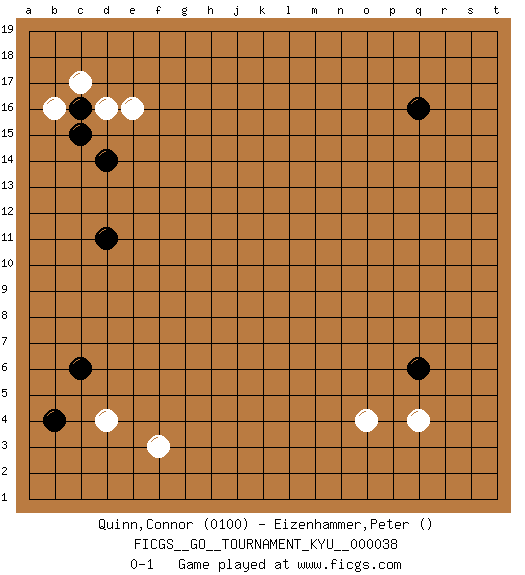 Last move : 0-1 2007 September 7 13:24:4 [Event "FICGS__GO__TOURNAMENT_KYU__000038"] [Site "FICGS"] [Date "2007.06.27"] [Round "1"] [Black "Quinn,Connor"] [White "Eizenhammer,Peter"] [Result "0-1"] [Rating 1 "0100"] 1.q16 d4 2.c16 q4 3.c6 f3 4.b4 e16 5.d14 c17 6.d11 b16 7.c15 d16 8.q6 o4 0-1 This go game has been lost on time (started : 2007.06.27 9:16:58) Here are the names of the openings (joseki) played in the four corners : Corner d4 : d4 c6 Hoshi (Hwajeom, Seongjeom, Xingwei`) 4-4 Point. The star or hoshi (4-4) point, emphasizing influence at the potential expense of territory. Ikken Kakari (Hankan Keolch'im, Yi Gua`jiao~, 1-Space Low Approach). Black 2 is the standard approach move to the 4-4. Corner d16 : c16 e16 Komoku (Somok, Xiao~mu`) 3-4 Point. The komoku (3-4) point is the traditional corner enclosure move.. Ikken Takagakari (Hankan Nop'dakeolch'im, Yi Gaogua`jiao~, 1-Space High Approach). The 5-4 approach move has become more popular in modern times, as modern Go emphasizes speed and influence. Corner q4 : q4 q6 Hoshi (Hwajeom, Seongjeom, Xingwei`) 4-4 Point. The star or hoshi (4-4) point, emphasizing influence at the potential expense of territory. Ikken Takagakari (Hankan Nop'dakeolch'im, Yi Gaojia, 1-Space High Approach). White typically responds at 6-4 or 3-10. White 4-10 is played when White finds play on the right side advantageous. White 4-8 or 3-8 may be played when White has support at top. Player White won this Go (weiqi, baduk) game. Follow this game move after move (download)Go is essentially a form of harmony. Go in the 21st century will have to be go of the 'harmony of the six points - the four quarters, the above and the below.' As in life we will need to view the whole rather than the part. Japanese go has focused too heavily on the local (joseki) rather than the whole for 300 years. The reason the Chinese and Koreans are overtaking the Japanese is that they are closer to achieve this whole-board view. (Go Seigen, 9p, 1994) The human is the only animal species whose members are able to talk themselves into difficulties that would not otherwise exist. (Wendell Johnson)