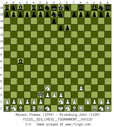 Last move : 1-0 2019 November 23 3:7:41 [Event "FICGS__BIG_CHESS__TOURNAMENT__000120"] [Site "FICGS"] [Date "2019.10.19"] [Round "1"] [White "Rezack,Thomas"] [Black "Rivenburg,John"] [Result "1-0"] [WhiteElo "1394"] [BlackElo "1128"] 1.m2-m4 k15-k13 2.h2-g4 j14-j13 3.g2-g3 l16-c8 4.h1-f3 1-0 This big chess game has been lost on time (started : 2019.10.19 14:17:30) Follow this game move after move (download)For me, Chess is life and every game is like a new life. Every Chess player gets to live many lives in one lifetime. (Eduard Gufeld) Mein Name ist Rustam Kamsky. Sie haben meinen Sohn belästigt. Bereiten Sie sich aufs Sterben vor. (Rustam Kamsky) A la fecha, Fischer esta simplemente un nivel arriba de todos los mejores jugadores de Ajedrez del mundo. (John Jacobs) Des points faibles ou des trous dans la position de l'adversaire doivent être occupés par des pièces et non pas par des pions. (Siegbert Tarrasch) Cactus - It is depressed cucumber. (Ilmars Cirulis)
