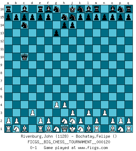 Last move : 0-1 2019 November 24 7:23:32 [Event "FICGS__BIG_CHESS__TOURNAMENT__000120"] [Site "FICGS"] [Date "2019.10.19"] [Round "1"] [White "Rivenburg,John"] [Black "Bochatay,Felipe"] [Result "0-1"] [WhiteElo "1128"] [BlackElo ""] 1.g2-g4 g15-g13 2.h3-h4 h16-c11 3.l2-l3 c11-c2 4.n2-n3 b16-c14 5.d2-d3 c2-c10 0-1 This big chess game has been lost on time (started : 2019.10.19 14:17:30) Follow this game move after move (download)Fischer wanted to give the Russians a taste of their own medicine. (Larry Evans) Im Schach gewinnt jeder. Hat man Freunde am Spiel - und das ist die Hauptsache - ist auch der Verlust einer Partie kein Unglück. (David Bronstein) El jugador de combinación piensa hacia adelante; comienza de la posición dada y trabaja las movidas contundentes en su mente. (Emanuel Lasker) Toutes les manuvres exécutées sur une colonne ouverte ont pour but ultime l'intrusion définitive sur la septième ou la huitième rangée, en plein cur de la position ennemie. (Aaron Nimzovitch) When the going gets tactical, the computers get going. (Hyatt)