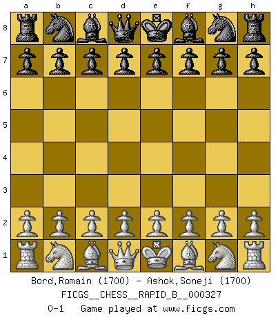 Last move : 0-1 2019 November 20 11:18:58 [Event "FICGS__CHESS__RAPID_B__000327"] [Site "FICGS"] [Date "2019.10.21"] [Round "1"] [White "Bord,Romain"] [Black "Ashok,Soneji"] [Result "0-1"] [WhiteElo "1700"] [BlackElo "1700"] 0-1 This chess game has been lost on time (started : 2019.10.21 0:15:39) Player Black won this chess game. Follow this game move after move (download)Chess is the art which expresses the science of logic. (Mikhail Botvinnik) Ich rechne überhaupt nicht voraus. Ich gewinne auch so. (Robert James Fischer) Muchos jugadores de Ajedrez se sorprendían cuando después de la partida, Fischer explicaba con calma: 'Yo ya había analizado esta posibilidad' en una posición en la cual yo creía que no era posible de prever desde la apertura. (Mikhail Tal) Roi des jeux et jeu des rois, les échecs portent en eux un sentiment d'infini. Ils donnent à celui qui s'est efforcé d'en approfondir les arcanes l'impression de n'être pas à la mesure de l'homme; en fait, ils constituent un résumé de l'univers, un microcosme, et figurent cette grande échelle qui, dans les plans de la lumière descend jusqu'à la matière, qui des abîmes insondables remonte jusqu'en l'infini de Dieu. (Pyrame) We cannot be sure of having something to live for unless we are willing to die for it. (Ernesto Che Guevara)