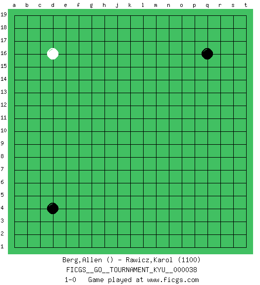 Last move : 1-0 2007 July 29 13:18:2 [Event "FICGS__GO__TOURNAMENT_KYU__000038"] [Site "FICGS"] [Date "2007.06.27"] [Round "1"] [Black "Berg,Allen"] [White "Rawicz,Karol"] [Result "1-0"] [Rating 2 "1100"] 1.d4 d16 2.q16 1-0 This go game has been lost on time (started : 2007.06.27 9:16:58) Here are the names of the openings (joseki) played in the four corners : Player Black won this Go (weiqi, baduk) game. Follow this game move after move (download)A knight's move near the edge of the board cannot be cut. (Bill Taylor) Fortune favours the audacious. (Desiderius Erasmus)