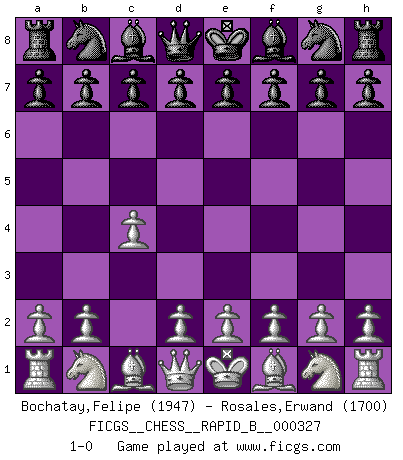 Last move : 1-0 2019 November 20 11:18:58 [Event "FICGS__CHESS__RAPID_B__000327"] [Site "FICGS"] [Date "2019.10.21"] [Round "1"] [White "Bochatay,Felipe"] [Black "Rosales,Erwand"] [Result "1-0"] [WhiteElo "1947"] [BlackElo "1700"] 1.c4 1-0 This chess game has been lost on time (started : 2019.10.21 0:15:39) English Opening Player White won this chess game. Follow this game move after move (download)If your opponent cannot do anything active, then don't rush the position; instead you should let him sit there, suffer, and beg you for a draw. (Jeremy Silman) Ich bin der einzige Schachspieler, der sich während der Vorbereitungen zum Turnier verletzt hat. (Woody Allen) Preferería tener un Peón que un dedo. (Reuben Fine) Toutes les manuvres exécutées sur une colonne ouverte ont pour but ultime l'intrusion définitive sur la septième ou la huitième rangée, en plein cur de la position ennemie. (Aaron Nimzovitch) How many people work in NATO Headquarters ? - About half of them. (Dirk Stikker, NATO general secretary)
