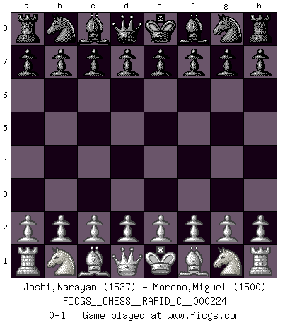 Last move : 0-1 2019 November 21 0:15:24 [Event "FICGS__CHESS__RAPID_C__000224"] [Site "FICGS"] [Date "2019.10.21"] [Round "1"] [White "Joshi,Narayan"] [Black "Moreno,Miguel"] [Result "0-1"] [WhiteElo "1527"] [BlackElo "1500"] 0-1 This chess game has been lost on time (started : 2019.10.21 15:40:35) Player Black won this chess game. Follow this game move after move (download)The winner of the game is the player who makes the next-to-last mistake. (Savielly Tartakover) Verschiedene, sehr schätzbare und im Laufe des Lebens nützliche Eigenschaften des Geistes können durch das Schachspiel erworben und gekräftigt werden, so dass sie zu Gewohnheiten werden, die uns nie im Stich lassen. (Benjamin Franklin) El Ajedrez es una hermosa aventura. (Bent Larsen) Les Cavaliers se révèlent fort utiles dans les positions fermées. D'habitude, les Fous sont un peu plus forts que les Cavaliers dans les positions ouvertes. Qu'on le veuille ou non, il restera toujours des exceptions ! For a mechanic, you seem to do an excessive amount of thinking. (C-3PO in Star Wars ep.2)